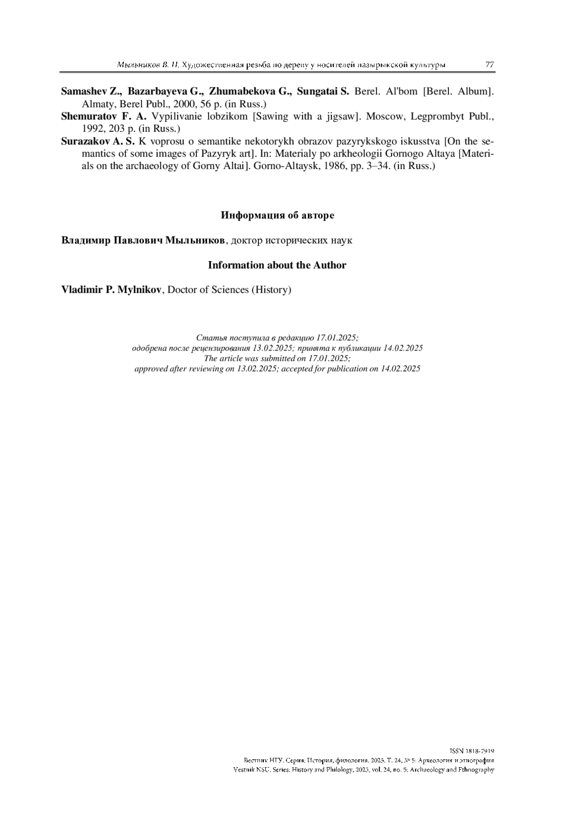 8. Мыльников В. П. Резьба по дереву в скифское время (Северная Азия). Новосибирск: Изд-во ИАЭТ СО РАН, 2011. 188 с.