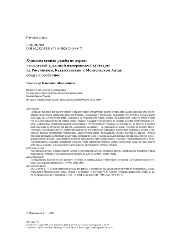 Проведен технико-технологический и сравнительно-культурный анализ отдельных исследованных археологических памятников скифского времени России, Казахстана и Монголии. Выявлено, что курганы пазырыкской культуры на могильниках Верх-Кальджин на Российском Алтае, Берель на Казахском Алтае и Олон-Курин гол на Монгольском Алтае имеют много общего. Сходство обнаружено во многих деталях погребального обряда: одинаковые каменные насыпи, ориентация и глубина прямоугольных могильных ям, во многом похожие погребальные сооружения из дерева, положение усопшего – на деревянном ложе, головой на восток. Идентичность сопроводительного инвентаря выражена в комплектах одежды и войлочных головных уборах с наборами резных деревянных украшений, аналогичных видах вооружения, наборе посуды из дерева. Особая близость проявлена в мотивах различных украшений коня и человека, выполненных из дерева, особенно в художественной резьбе. Абсолютное подобие прослежено при комплексном технико-технологическом и культурологическом анализе украшений конской узды сопроводительных коней, нагрудных блях, жезлов власти верховных вождей. В их видовом многообразии преобладают образы грифов.