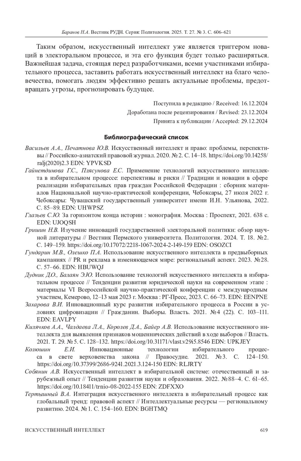 11. Тертышный В.А. Интеграция искусственного интеллекта в избирательный процесс как глобальный тренд: правовой аспект // Интеллектуальные ресурсы - региональному развитию. 2024. № 1. С. 154-160. EDN: BGHTMQ