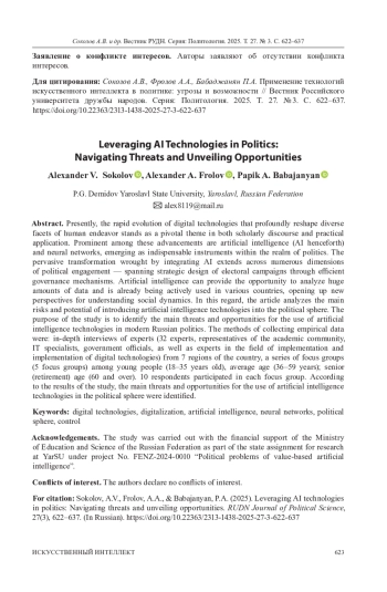 В настоящее время развитие цифровых технологий, которые коренным образом трансформируют различные аспекты человеческой активности, является одной из наиболее актуальных тем в науке и практике. Одной из таких технологий является искусственный интеллект (далее - ИИ) и нейросети, которые становятся все более значимыми инструментами в политической сфере. Трансформационные изменения, обусловленные интеграцией искусственного интеллекта, охватывают многие аспекты политической деятельности - начиная от планирования избирательных кампаний и заканчивая оптимальным управлением государственной машиной. Искусственный интеллект может предоставить возможность анализировать огромные массивы данных и уже активно применяется в различных странах, открывая новые перспективы для понимания социальных динамик. Проанализированы основные риски и потенциал внедрения технологий искусственного интеллекта в политическую сферу. Цель исследования - определение основных угроз и возможностей применения технологий искусственного интеллекта в современной российской политике. Методами сбора эмпирических данных стали глубинное интервью экспертов (32 эксперта, представители академического сообщества, специалисты в области IT-технологий, сотрудники органов власти, а также эксперты в области реализации и внедрения цифровых технологий) из 7 регионов страны, серия фокус-групп (5 фокус групп) среди представителей молодежи (18-35 лет), средний возраст (36-59 лет); старший (пенсионный) возраст (60 и более). В каждой фокус-группе участвовало 10 респондентов. По результатам исследования были выявлены основные угрозы и возможности применения технологий искусственного интеллекта в политической сфере.