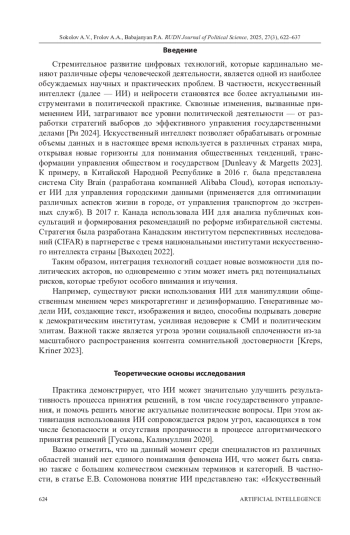 Стремительное развитие цифровых технологий, которые кардинально меняют различные сферы человеческой деятельности, является одной из наиболее обсуждаемых научных и практических проблем. В частности, искусственный интеллект (далее — ИИ) и нейросети становятся все более актуальными инструментами в политической практике. Сквозные изменения, вызванные применением ИИ, затрагивают все уровни политической деятельности — от разработки стратегий выборов до эффективного управления государственными делами [Ри 2024].