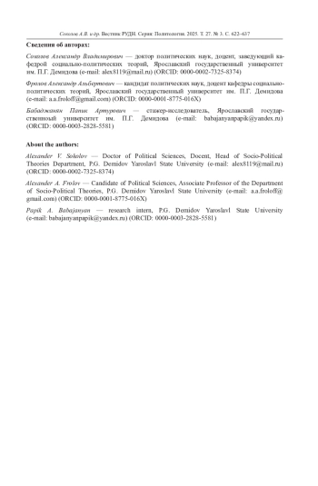 Современные мегаполисы представляют собой особые социально-экономические агломерации, в которых качество жизни, комфортная городская среда, развитие инфраструктуры, высокий уровень информационных технологий и доступность интернета создают привлекательный имидж территорий для молодого поколения. Особенности коммуникации и социализации городской среды современного мегаполиса определяются высоким уровнем цифровизации, скоростью и объемом информационных потоков. Все эти факторы влияют на ценностные ориентации и политические предпочтения молодых горожан. Актуальность исследования обусловлена влиянием цифровизации на процессы формирования политических норм, ценностей и моделей поведения у представителей молодого поколения. Цель исследования - выявление связи между ценностными предпочтениями молодежи, степенью их включенности в процессы сетевой коммуникации и цифровыми формами политического участия. Методологической основой исследования были выбраны ценностные концепции Р. Инглхарта, М. Рокича, теория гражданской культуры Г. А. Алмонда и С Верба, теория ценностных расколов С. М. Липсета - С. Роккана. Эмпирической базой исследования стали результаты онлайн-опроса молодежи крупных городов РФ. Многомерные методы анализа позволили выявить связь между моделью политического участия с использованием цифровых технологий и типами ценностных ориентаций городской молодежи. Результаты кластерного анализа выявили две политически активные группы, которые имеют разные идеологические и ценностные векторы деятельности. Основой размежеваний между двумя сегментами выступает ось с индивидуалистическими и коллективистскими полюсами, которые сочетаются с либеральными и консервативным ценностными приоритетами.