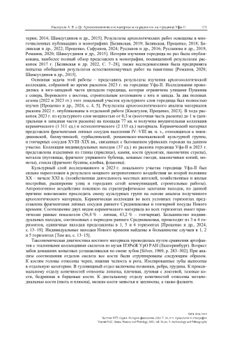 Публикуются результаты анализа археозоологической коллекции, собранной в ходе раскопок поселенческого памятника эпохи раннего Средневековья городища Уфа-II в 2023 г. Исследования проходили на локальном участке в юго-западной части памятника. В ходе работ было установлено, что культурный слой на данном участке подвергся мощному антропогенному воздействию во второй половине XX в. – начале XXI в., повлекшему за собой уничтожение / смешение слоев эпохи Средневековья и Нового времени. В связи с данным обстоятельством, результаты археозоологического исследования 2023 г. не позволяют в полной мере привязать остеологический материал к культурным группам раннего Средневековья и Нового времени. В коллекции присутствовали кости млекопитающих, птиц и рыб. Части костей млекопитающих принадлежат в основном домашним животным, доля диких видов незначительна.