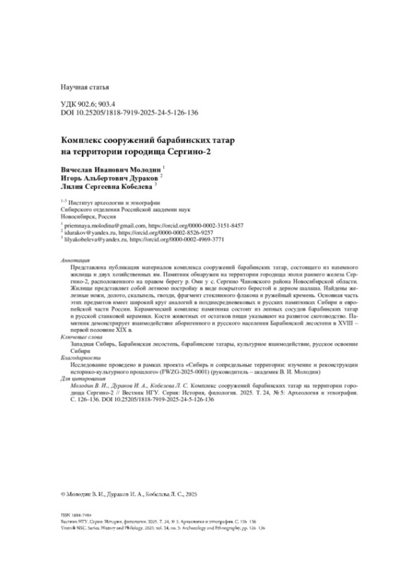 Представлена публикация материалов комплекса сооружений барабинских татар, состоящего из наземного жилища и двух хозяйственных ям. Памятник обнаружен на территории городища эпохи раннего железа Сергино-2; расположенного на правом берегу р. Оми у с. Сергино Чановского района Новосибирской области. Жилище представляет собой летнюю постройку в виде покрытого берестой и дерном шалаша. Найдены железные ножи; долото; скальпель; гвозди; фрагмент стеклянного флакона и ружейный кремень. Основная часть этих предметов имеет широкий круг аналогий в позднесредневековых и русских памятниках Сибири и европейской части России. Керамический комплекс памятника состоит из лепных сосудов барабинских татар и русской станковой керамики. Кости животных от остатков пищи указывают на развитое скотоводство. Памятник демонстрирует взаимодействие аборигенного и русского населения Барабинской лесостепи в XVIII – первой половине XIX в.