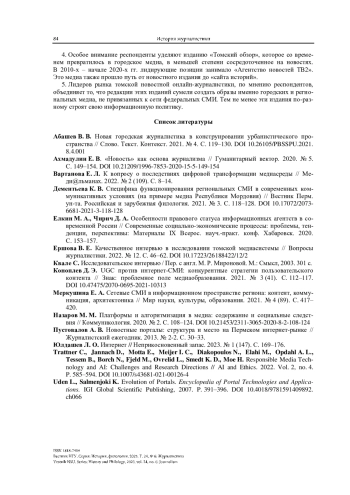 Рассматривается то, как представители томского медиасообщества через рефлексию своей профессиональной биографии и повседневных профессиональных практик оценивают развитие томской новостной онлайн-журналистики. На основе данных 14 полуструктурированных интервью выделено четыре группы этого сегмента томской медиасистемы. Первые две группы – веб-версии печатных изданий и новостные ленты на сайтах телерадиокомпаний – оцениваются респондентами как менее конкурентоспособные игроки на рынке новостной онлайн-журналистики. Другие две группы – информагентства, новостные порталы и городские интернет-издания – как лидеры сегмента. Выявлено, что за 30 лет в Томске в сфере новостных интернет-СМИ произошел качественный скачок от первых экспериментов с новостями к профессиональной новостной журналистике.