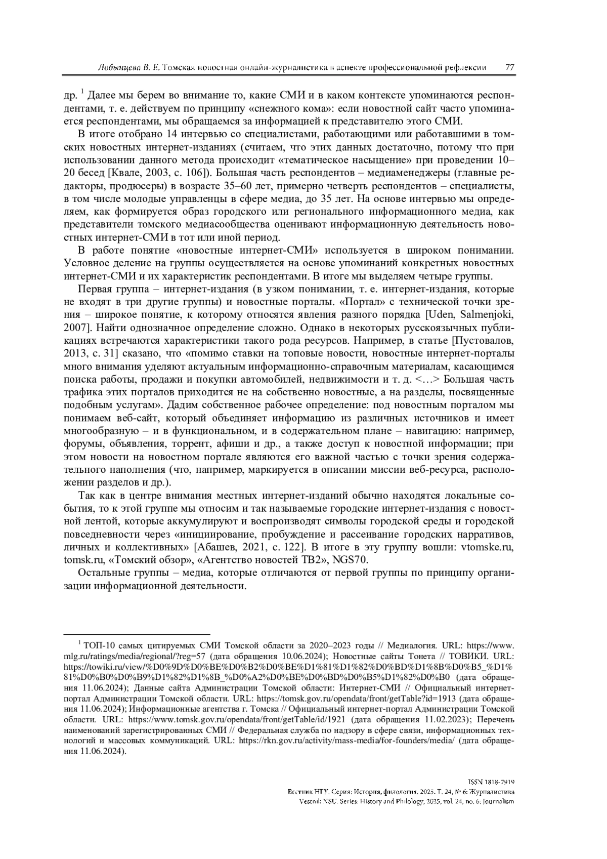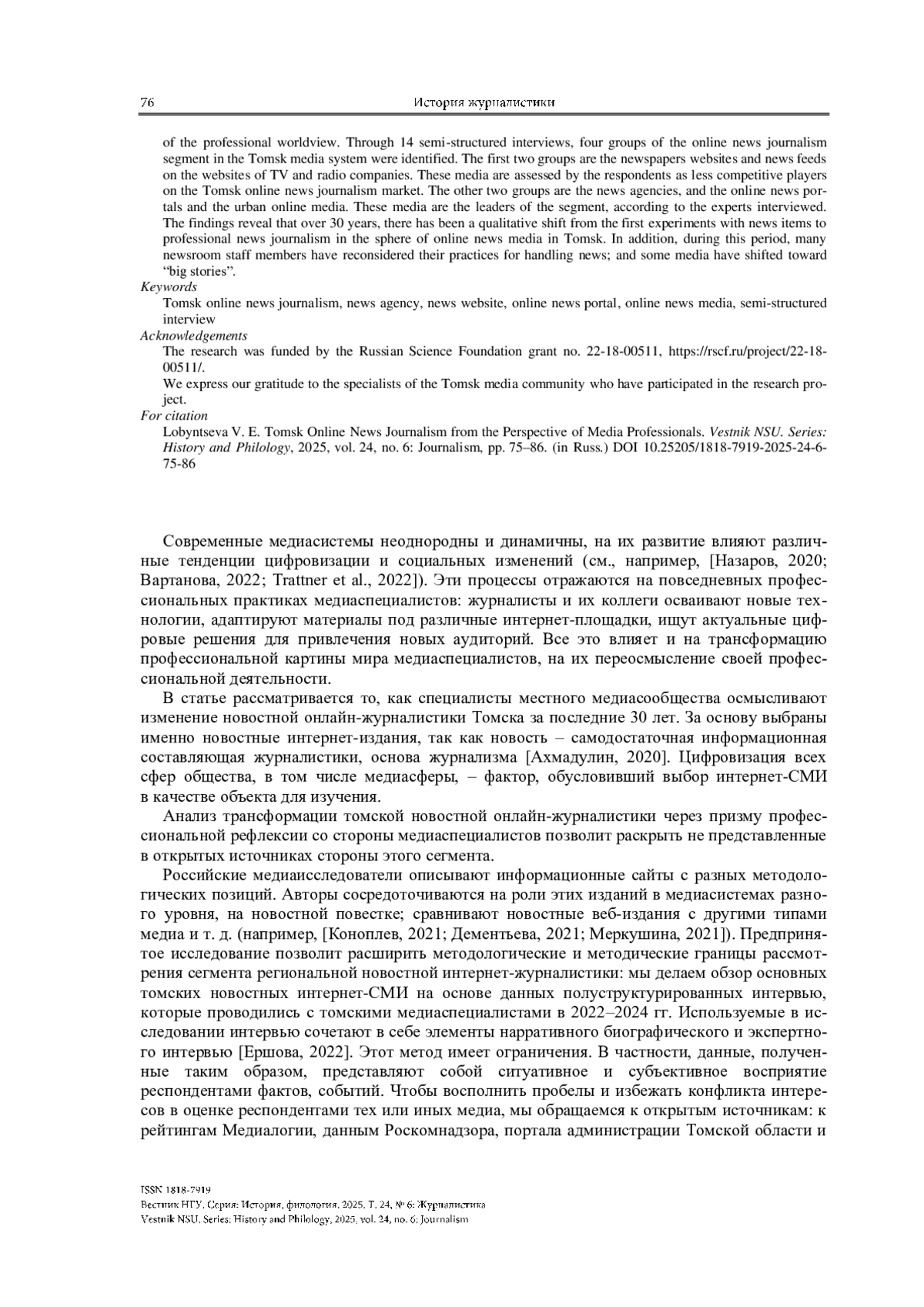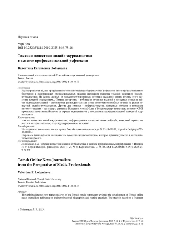 ЛОБЫНЦЕВА В. Е. ТОМСКАЯ НОВОСТНАЯ ОНЛАЙН-ЖУРНАЛИСТИКА В АСПЕКТЕ ПРОФЕССИОНАЛЬНОЙ РЕФЛЕКСИИ // ВЕСТНИК НГУ. СЕРИЯ: ИСТОРИЯ, ФИЛОЛОГИЯ. 2025. ТОМ 24, № 6