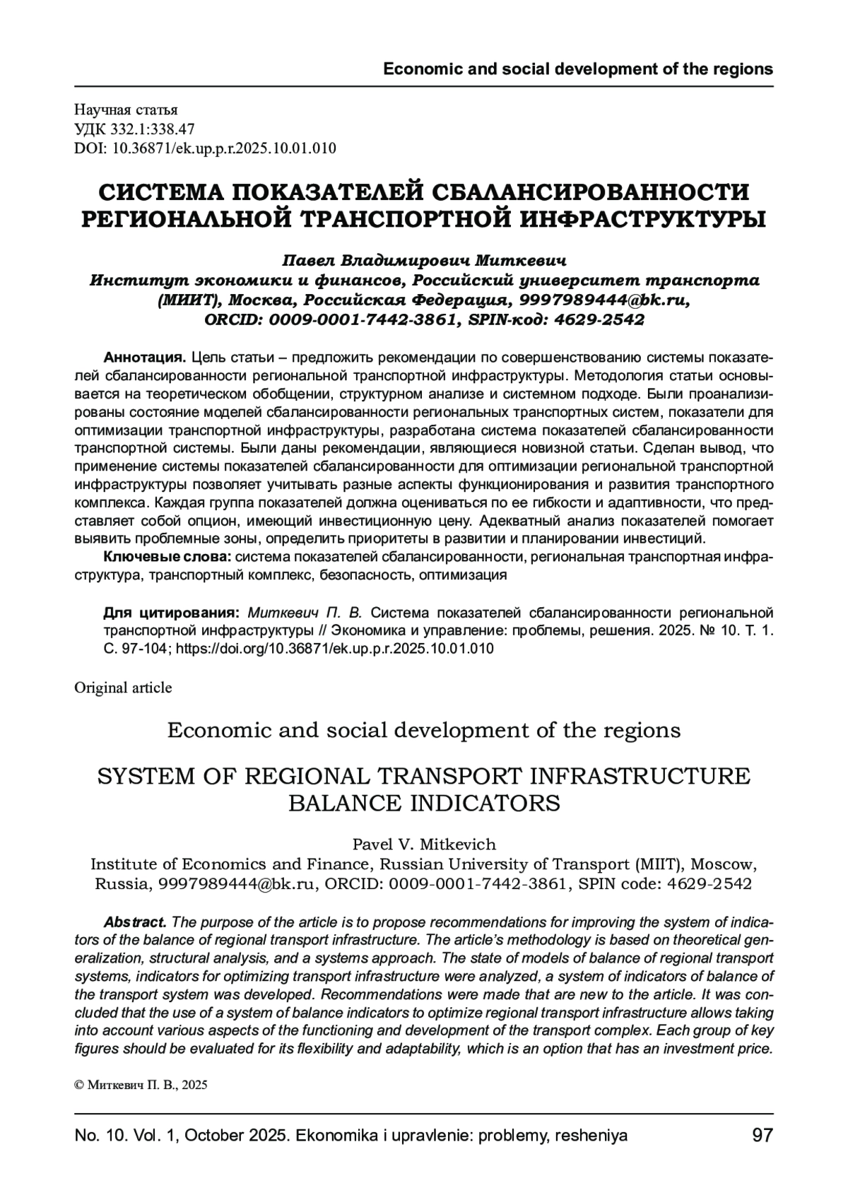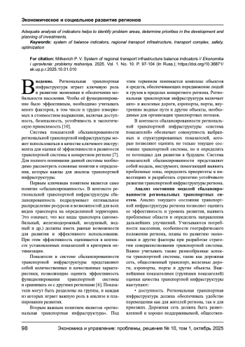 Цель статьи - предложить рекомендации по совершенствованию системы показателей сбалансированности региональной транспортной инфраструктуры. Методология статьи основывается на теоретическом обобщении, структурном анализе и системном подходе. Были проанализированы состояние моделей сбалансированности региональных транспортных систем, показатели для оптимизации транспортной инфраструктуры, разработана система показателей сбалансированности транспортной системы. Были даны рекомендации, являющиеся новизной статьи. Сделан вывод, что применение системы показателей сбалансированности для оптимизации региональной транспортной инфраструктуры позволяет учитывать разные аспекты функционирования и развития транспортного комплекса. Каждая группа показателей должна оцениваться по ее гибкости и адаптивности, что представляет собой опцион, имеющий инвестиционную цену. Адекватный анализ показателей помогает выявить проблемные зоны, определить приоритеты в развитии и планировании инвестиций.