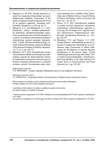 8. Михайлов М. В. Комплексная оценка экономической эффективности транспортной инфраструктуры региональной экономической системы // Современная наука: актуальные проблемы теории и практики. Серия: Экономика и право. - 2024. - № 1. - С. 30-34. EDN: CXWVKW