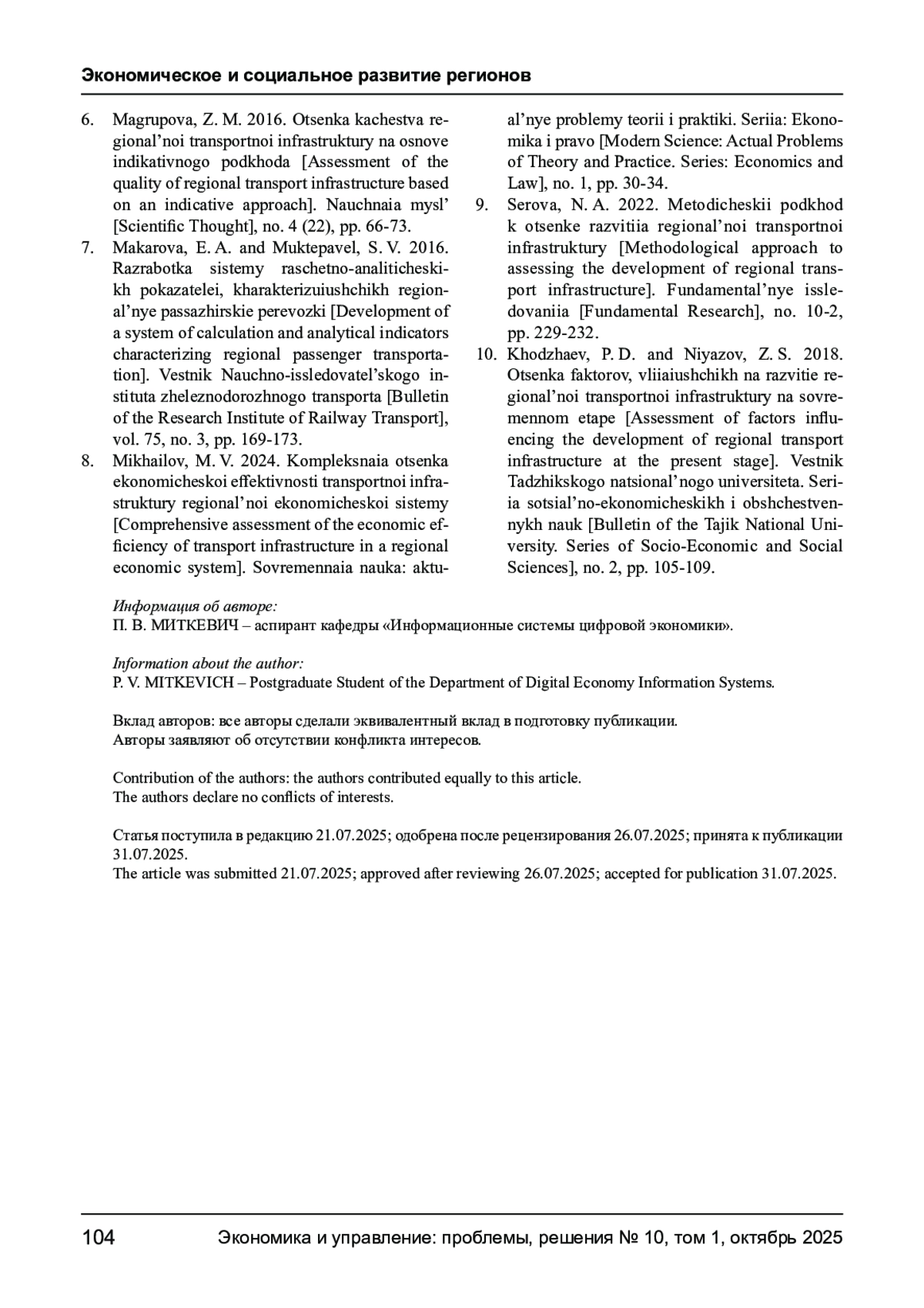 9. Серова Н. А. Методический подход к оценке развития региональной транспортной инфраструктуры // Фундаментальные исследования. - 2022. - № 10-2. - С. 229-232. EDN: YAFIHN
