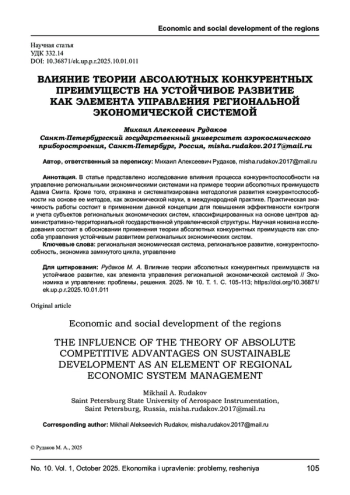 В статье представлено исследование влияния процесса конкурентоспособности на управление региональными экономическими системами на примере теории абсолютных преимуществ Адама Смита. Кроме того, отражена и систематизирована методология развития конкурентоспособности на основе ее методов, как экономической науки, в международной практике. Практическая значимость работы состоит в применении данной концепции для повышения эффективности контроля и учета субъектов региональных экономических систем, классифицированных на основе центров административно-территориальной государственной управленческой структуры. Научная новизна исследования состоит в обосновании применения теории абсолютных конкурентных преимуществ как способа управления устойчивым развитием региональных экономических систем.
