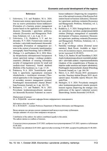 5. Романова И. В., Рудаков М. А. Повышение конкурентоспособности национальной экономики Российской Федерации на основе бизнес-индикаторов // Экономика и управление: проблемы, решения. 2025. Т. 2, № 2. С. 90-102. EDN: ZAWFFN