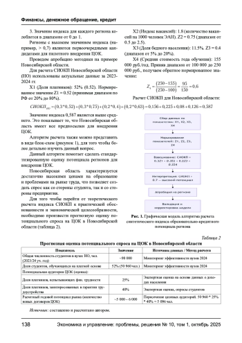 Данная научная статья посвящена актуальной проблеме на территории Российской Федерации, а именно - обеспечение финансовой доступности получения высшего образования, которое обусловлено значительным ростом стоимости обучения и сокращением количества бюджетных мест. Авторы статьи осуществляют анализ современного рынка образовательного кредитования, подчеркивая его явные недостатки, такие как: крайне высокие кредитные риски, слабая информированность абитуриентов, ограниченность программ с государственной поддержкой. Цель научного исследования - разработка и апробирование модернизированной модели целевого образовательного кредита (ЦОК), которая основана на трёхстороннем взаимодействии между студентом, кредитной организацией, предприятием-работодателем и государством. Научная новизна работы выражена в создании синтетического индекса образовательно-кредитного потенциала региона (СИОКП), который позволяет ранжировать регионы по приоритетности внедрения ЦОК на основе объединения социально-экономических и образовательных показателей. Методика, предложенная авторами, апробирована на данных Новосибирской области, тем самым подтвердив её значимость и выявив высокий потенциал региона для запуска пилотных программ. Результаты научного исследования демонстрируют, что разработанная модель снижает кредитные риски, повышает доступность получения образования и стимулирует подготовку качественно подготовленных востребованных кадров.