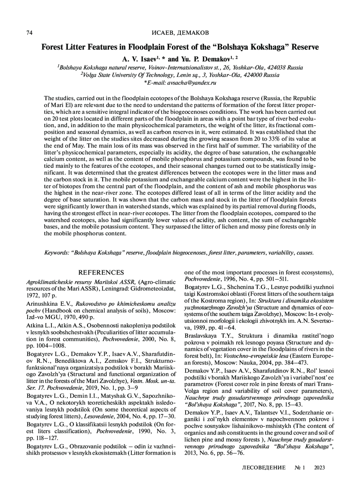 7. Богатырёв Л.Г., Дёмин И.И., Матышак Г.В., Сапожникова В.А. О некоторых теоретических аспектах исследования лесных подстилок // Лесоведение. 2004. № 4. С. 17–30. EDN: OVXXWV