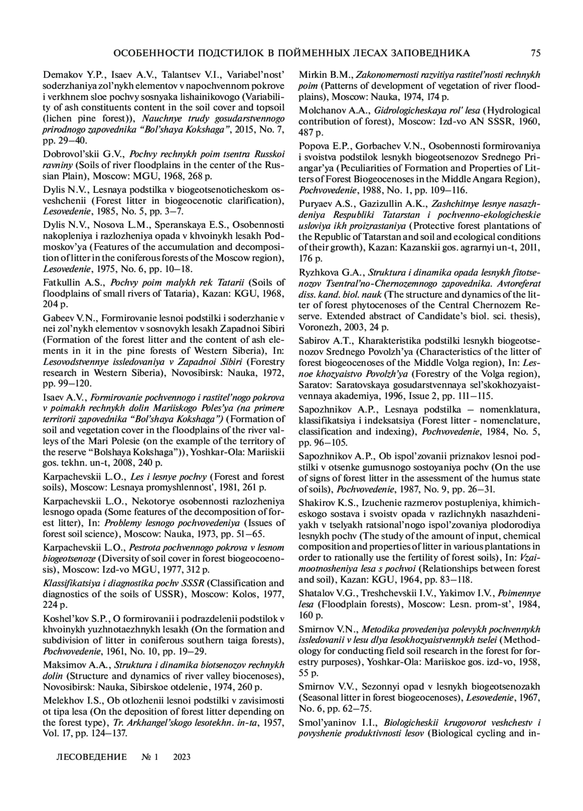 34. Сапожников А.П. Лесная подстилка – номенклатура, классификация и индексация // Почвоведение. 1984. № 5. С. 96–105. EDN: WGQPXH