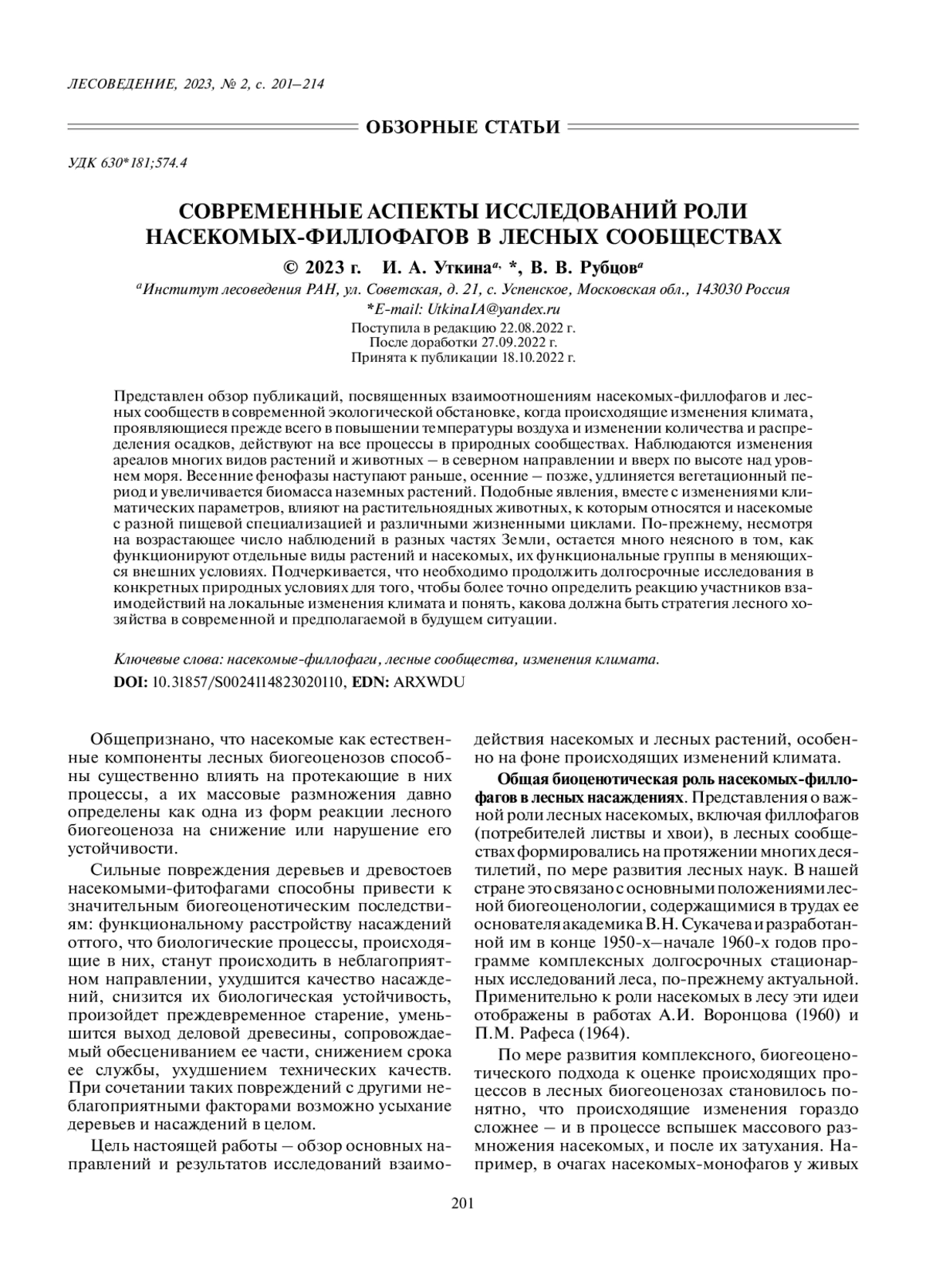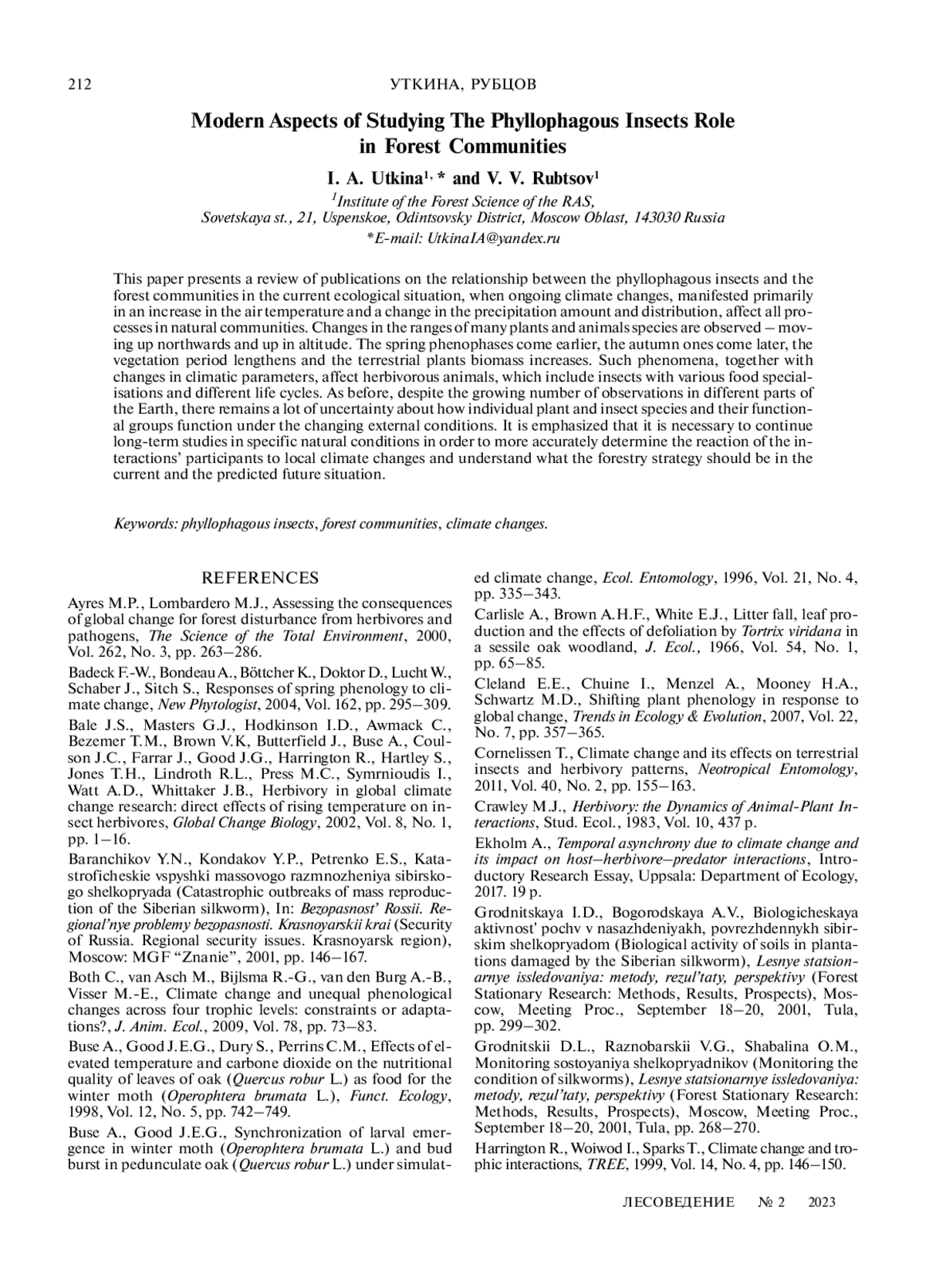 28. Рубцов В.В., Уткина И.А. Реакция насекомых-филлофагов на современные изменения климата // Лесоведение. 2019. № 5. С. 375–384. EDN: OGDWNK