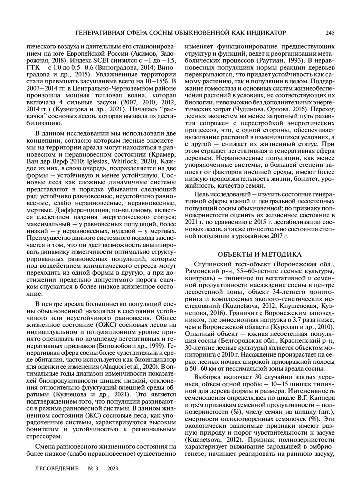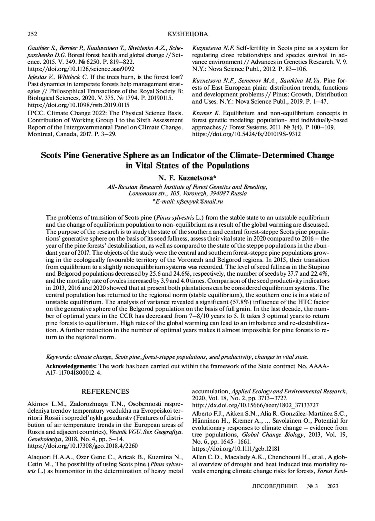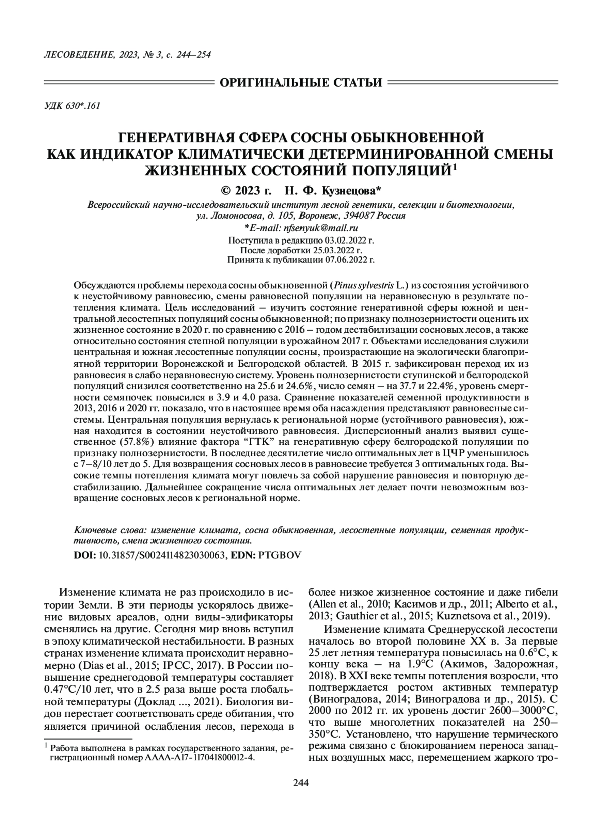 КУЗНЕЦОВА Н. Ф. ГЕНЕРАТИВНАЯ СФЕРА СОСНЫ ОБЫКНОВЕННОЙ КАК ИНДИКАТОР КЛИМАТИЧЕСКИ ДЕТЕРМИНИРОВАННОЙ СМЕНЫ ЖИЗНЕННЫХ СОСТОЯНИЙ ПОПУЛЯЦИЙ // ЛЕСОВЕДЕНИЕ. 2023. № 3