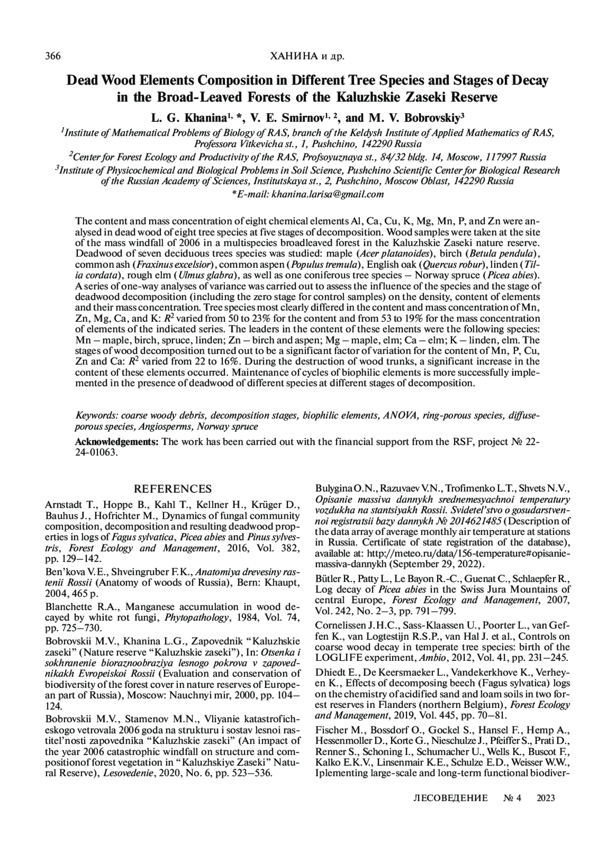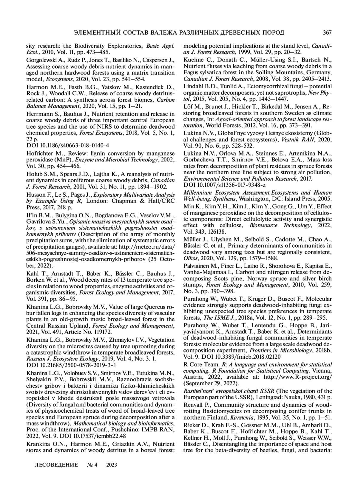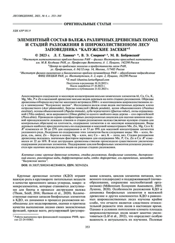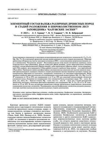 ХАНИНА Л. Г., СМИРНОВ В. Э., БОБРОВСКИЙ М. В. ЭЛЕМЕНТНЫЙ СОСТАВ ВАЛЕЖА РАЗЛИЧНЫХ ДРЕВЕСНЫХ ПОРОД И СТАДИЙ РАЗЛОЖЕНИЯ В ШИРОКОЛИСТВЕННОМ ЛЕСУ ЗАПОВЕДНИКА “КАЛУЖСКИЕ ЗАСЕКИ” // ЛЕСОВЕДЕНИЕ. 2023. № 4