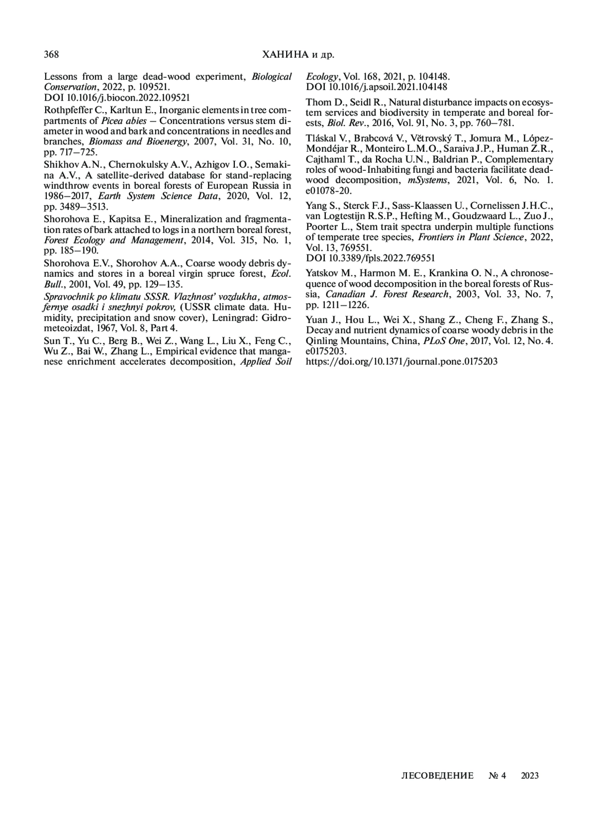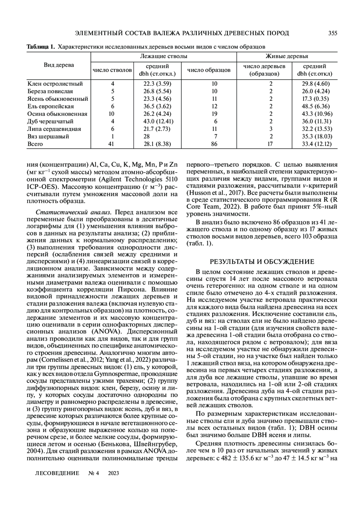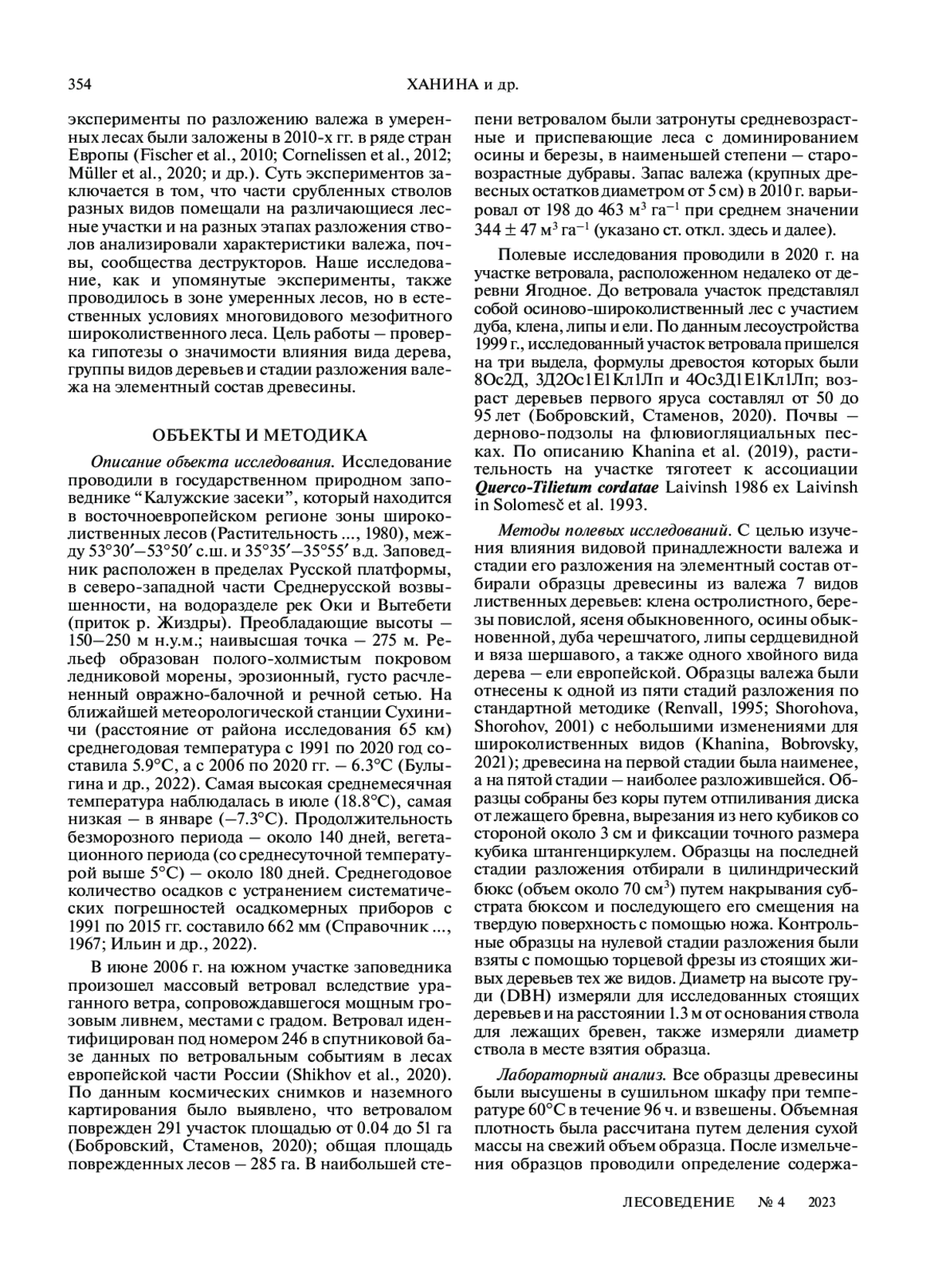 ХАНИНА Л. Г., СМИРНОВ В. Э., БОБРОВСКИЙ М. В. ЭЛЕМЕНТНЫЙ СОСТАВ ВАЛЕЖА РАЗЛИЧНЫХ ДРЕВЕСНЫХ ПОРОД И СТАДИЙ РАЗЛОЖЕНИЯ В ШИРОКОЛИСТВЕННОМ ЛЕСУ ЗАПОВЕДНИКА “КАЛУЖСКИЕ ЗАСЕКИ” // ЛЕСОВЕДЕНИЕ. 2023. № 4