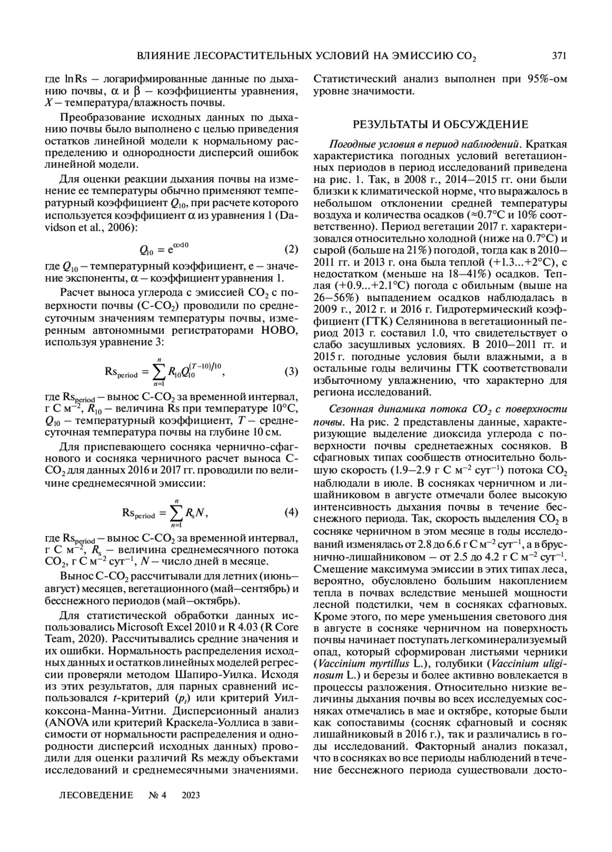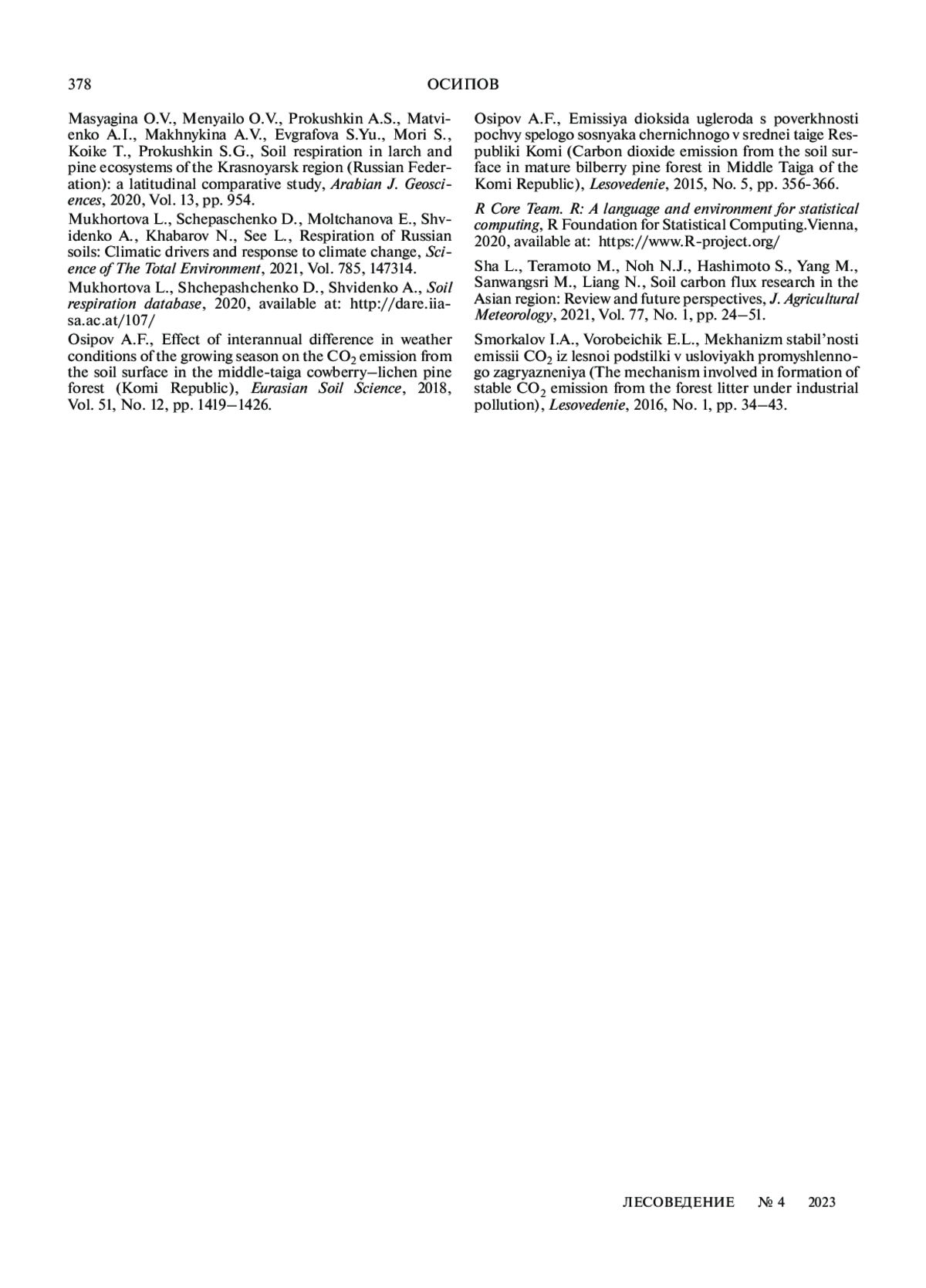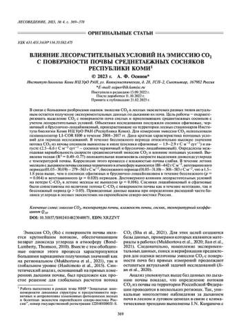 24. Osipov A.F. Effect of interannual difference in weather conditions of the growing season on the CO2 emission from the soil surface in the middle-taiga cowberry–lichen pine forest (Komi Republic) // Eurasian Soil Science. 2018. V. 51. № 12. P. 1419–1426. EDN: WUOIPD