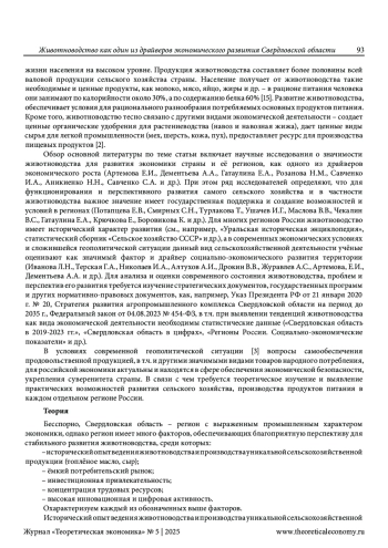 Обзор основной литературы по теме статьи включает научные исследования о значимости животноводства для развития экономики страны и её регионов, как одного из драйверов экономического роста (Артемова Е. И., Дементьева А. А., Гатаулина Е. А., Розанова Н. М., Савченко И. А., Аникиенко Н. Н., Савченко С. А. и др.). При этом ряд исследователей определяют, что для функционирования и перспективного развития самого сельского хозяйства и в частности животноводства важное значение имеет государственная поддержка и создание возможностей и условий в регионах (Потапцева Е. В., Смирных С. Н., Турлакова Т., Ушачев И. Г., Маслова В. В., Чекалин В. С., Гатаулина Е. А., Крючкова Е., Боровикова К. и др.). Для многих регионов России животноводство имеет исторический характер развития (см., например, «Уральская историческая энциклопедия», статистический сборник «Сельское хозяйство СССР» и др.), а в современных экономических условиях и сложившейся геополитической ситуации данный вид сельскохозяйственной деятельности учёные оценивают как значимый фактор и драйвер социально-экономического развития территории (Иванова Л. Н., Терская Г. А., Николаев И. А., Алтухов А. И., Дрокин В. В., Журавлев А. С., Артемова, Е. И., Дементьева А. А. и др.). Для анализа и оценки современного состояния животноводства, проблем и перспектив его развития требуется изучение стратегических документов, государственных программ и других нормативно-правовых документов, как, например, Указ Президента РФ от 21 января 2020 г. № 20, Стратегия развития агропромышленного комплекса Свердловской области на период до 2035 г., Федеральный закон от 04.08.2023 № 454-ФЗ, в т. ч. при выявлении тенденций животноводства как вида экономической деятельности необходимы статистические данные («Свердловская область в 2019-2023 гг.», «Свердловская область в цифрах», «Регионы России. Социально-экономические показатели» и др.).