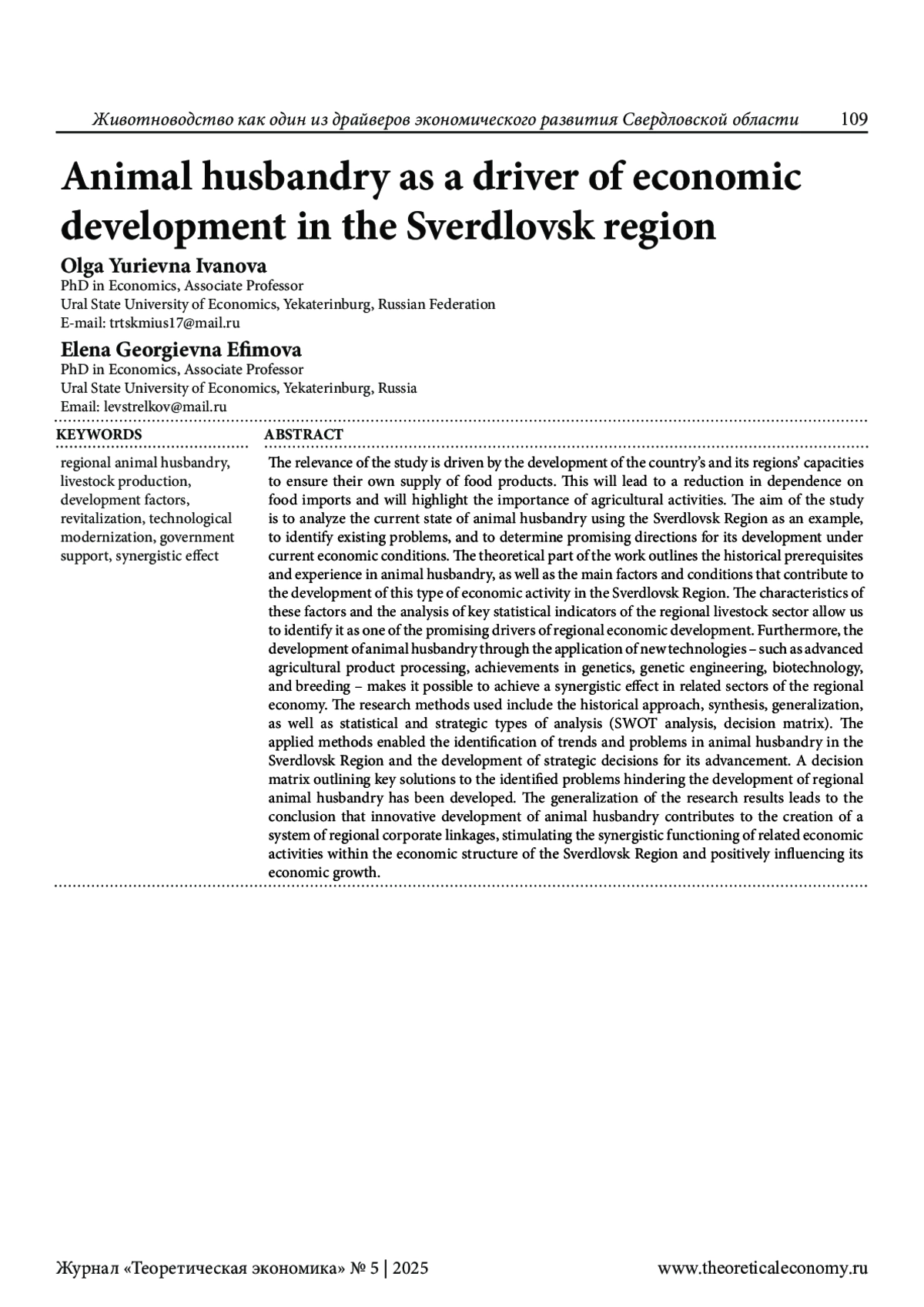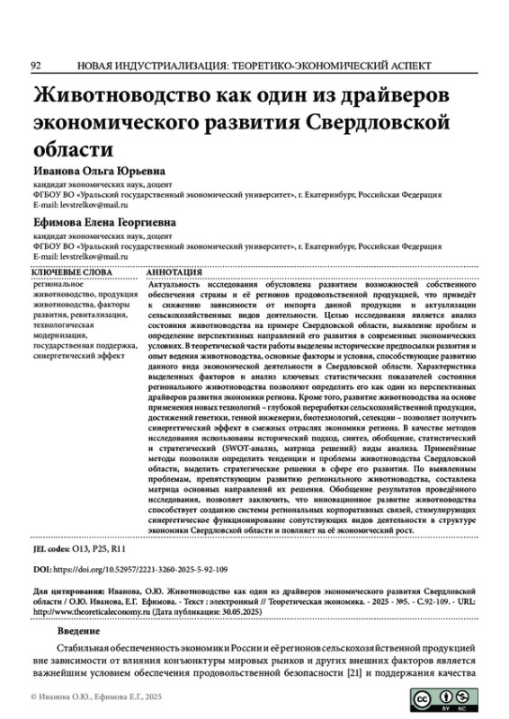 Актуальность исследования обусловлена развитием возможностей собственного обеспечения страны и её регионов продовольственной продукцией, что приведёт к снижению зависимости от импорта данной продукции и актуализации сельскохозяйственных видов деятельности. Целью исследования является анализ состояния животноводства на примере Свердловской области, выявление проблем и определение перспективных направлений его развития в современных экономических условиях. В теоретической части работы выделены исторические предпосылки развития и опыт ведения животноводства, основные факторы и условия, способствующие развитию данного вида экономической деятельности в Свердловской области. Характеристика выделенных факторов и анализ ключевых статистических показателей состояния регионального животноводства позволяют определить его как один из перспективных драйверов развития экономики региона. Кроме того, развитие животноводства на основе применения новых технологий - глубокой переработки сельскохозяйственной продукции, достижений генетики, генной инженерии, биотехнологий, селекции - позволяет получить синергетический эффект в смежных отраслях экономики региона. В качестве методов исследования использованы исторический подход, синтез, обобщение, статистический и стратегический (SWOT-анализ, матрица решений) виды анализа. Применённые методы позволили определить тенденции и проблемы животноводства Свердловской области, выделить стратегические решения в сфере его развития. По выявленным проблемам, препятствующим развитию регионального животноводства, составлена матрица основных направлений их решения. Обобщение результатов проведённого исследования, позволяет заключить, что инновационное развитие животноводства способствует созданию системы региональных корпоративных связей, стимулирующих синергетическое функционирование сопутствующих видов деятельности в структуре экономики Свердловской области и повлияет на её экономический рост.