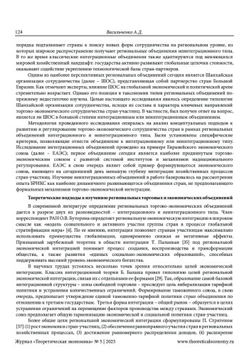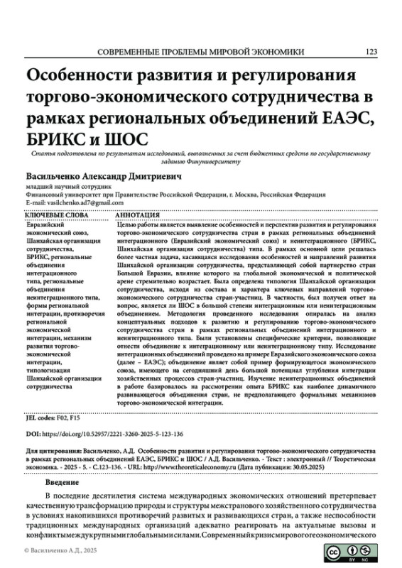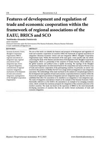 Целью работы является выявление особенностей и перспектив развития и регулирования торгово-экономического сотрудничества стран в рамках региональных объединений интеграционного (Евразийский экономический союз) и неинтеграционного (БРИКС, Шанхайская организация сотрудничества) типа. В рамках основной цели решалась более частная задача, касающаяся исследования особенностей и направлений развития Шанхайской организации сотрудничества, представляющей собой партнерство стран Большой Евразии, влияние которого на глобальной экономической и политической арене стремительно возрастает. Была определена типология Шанхайской организации сотрудничества, исходя из состава и характера ключевых направлений торгово-экономического сотрудничества стран-участниц. В частности, был получен ответ на вопрос, является ли ШОС в большой степени интеграционным или неинтеграционным объединением. Методология проведенного исследования опиралась на анализ концептуальных подходов к развитию и регулированию торгово-экономического сотрудничества стран в рамках региональных объединений интеграционного и неинтеграционного типа. Были установлены специфические критерии, позволяющие отнести объединение к интеграционному или неинтеграционному типу. Исследование интеграционных объединений проведено на примере Евразийского экономического союза (далее - ЕАЭС); объединение являет собой пример формирующегося экономического союза, имеющего на сегодняшний день большой потенциал углубления интеграции хозяйственных процессов стран-участниц. Изучение неинтеграционных объединений в работе базировалось на рассмотрении опыта БРИКС как наиболее динамичного развивающегося объединения стран, не предполагающего формальных механизмов торгово-экономической интеграции.