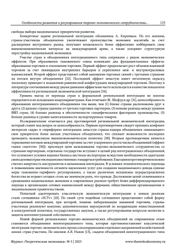В современной литературе определение региональных торгово-экономических объединений дается в разрезе двух их разновидностей – интеграционного и неинтеграционного типа. Членкорреспондент РАН О. В. Буторина определяет региональную экономическую интеграцию в широком смысле как «модель сознательного и активного участия группы стран в процессе глобальной стратификации мира» [4]. По ее мнению, интеграция позволяет странам участницам максимально использовать преимущества глобализации, одновременно снижая ее негативные эффекты. Признанный зарубежный теоретик в области интеграции Т. Паланкаи [35] под региональной экономической интеграцией понимает процесс создания, воспроизводства и трансформации общества, а также развития «единых социально-экономических образований», способных поддерживать высокий уровень экономического богатства.