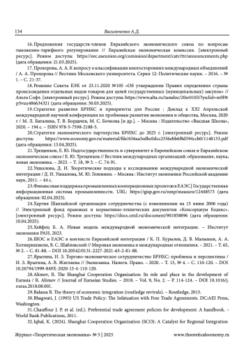 1. Арапова, Е. Я. “Интеграция интеграций” и перспективы БРИКС+ / Е. Я. Арапова // Мировая экономика и международные отношения. - 2019. - Т. 63, № 4. - С. 5-13. DOI: 10.20542/0131-2227-2019-63-4-5-13 EDN: ACGBHG