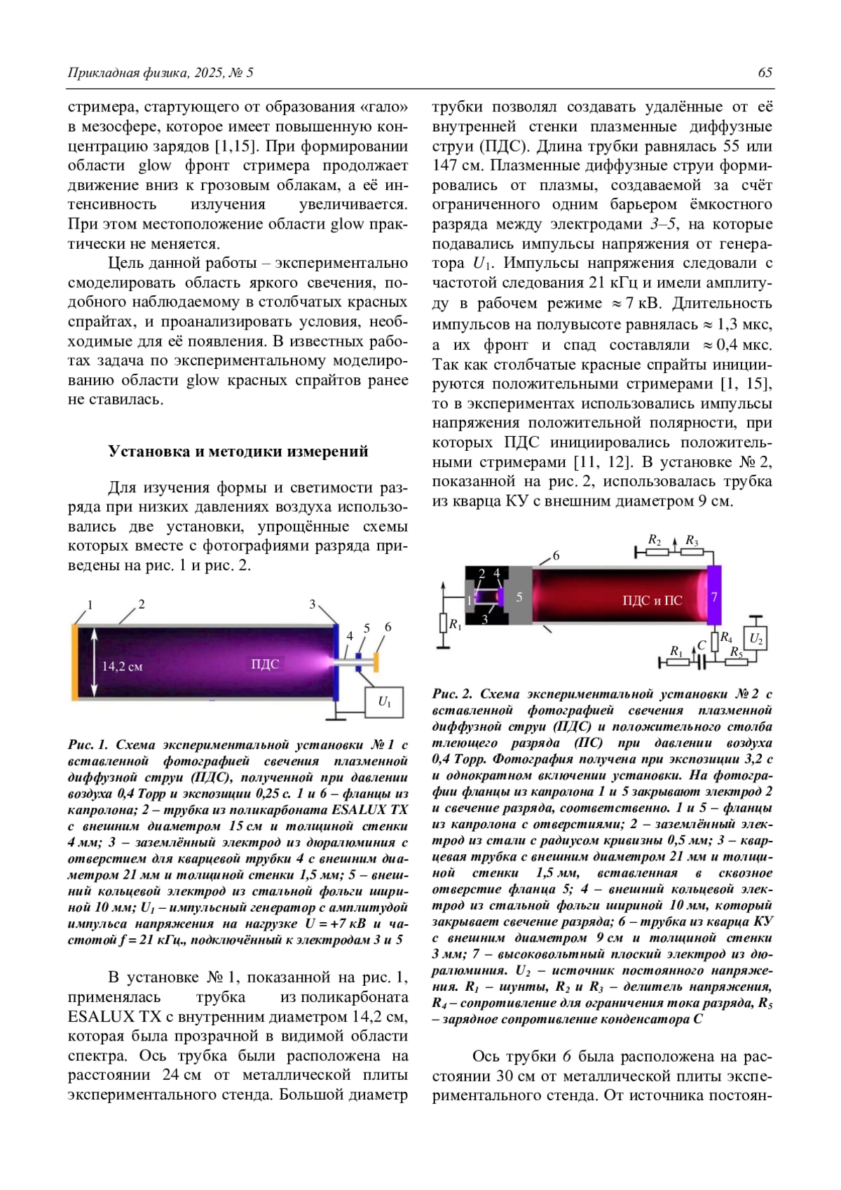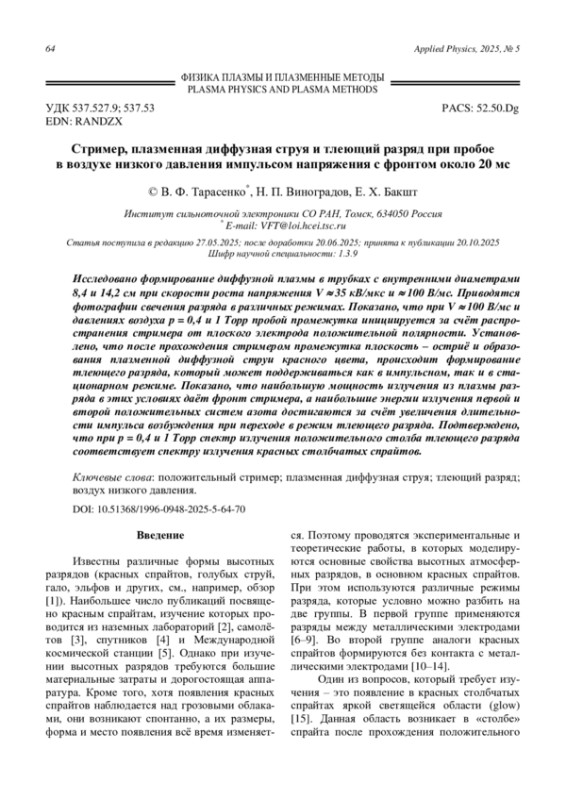 Исследовано формирование диффузной плазмы в трубках с внутренними диаметрами 8,4 и 14,2 см при скорости роста напряжения V 35 кВ/мкс и 100 В/мс. Приводятся фотографии свечения разряда в различных режимах. Показано, что при V 100 В/мс и давлениях воздуха p = 0,4 и 1 Торр пробой промежутка инициируется за счёт распро-странения стримера от плоского электрода положительной полярности. Установлено, что после прохождения стримером промежутка плоскость – остриё и образования плазменной диффузной струи красного цвета, происходит формирование тлеющего разряда, который может поддерживаться как в импульсном, так и в стационарном режиме. Показано, что наибольшую мощность излучения из плазмы разряда в этих условиях даёт фронт стримера, а наибольшие энергии излучения первой и вто-рой положительных систем азота достигаются за счёт увеличения длительности импульса возбуждения при переходе в режим тлеющего разряда. Подтверждено, что при p = 0,4 и 1 Торр спектр излучения положительного столба тлеющего разряда соответствует спектру излучения красных столбчатых спрайтов.