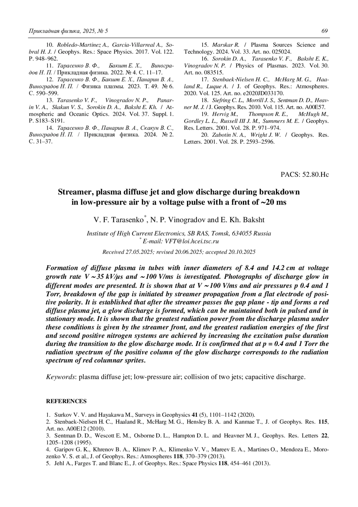 - Sorokin D. A., Tarasenko V. F., Baksht E. K., Vinogradov N. P. / Physics of Plasmas. 2023. Vol. 30. Art. no. 083515.