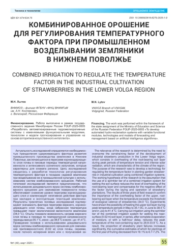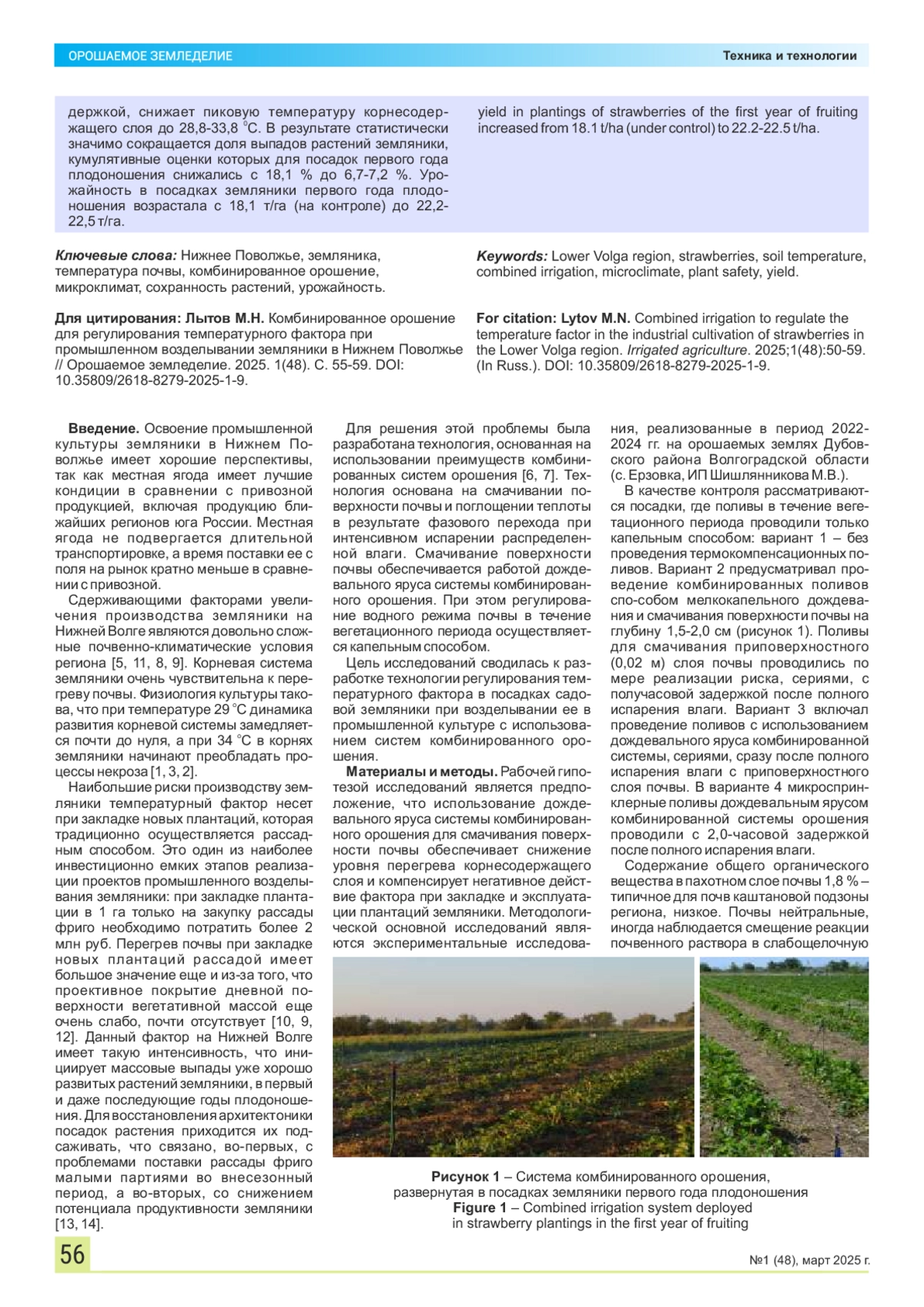 ЛЫТОВ М. Н. КОМБИНИРОВАННОЕ ОРОШЕНИЕ ДЛЯ РЕГУЛИРОВАНИЯ ТЕМПЕРАТУРНОГО ФАКТОРА ПРИ ПРОМЫШЛЕННОМ ВОЗДЕЛЫВАНИИ ЗЕМЛЯНИКИ В НИЖНЕМ ПОВОЛЖЬЕ // ОРОШАЕМОЕ ЗЕМЛЕДЕЛИЕ. 2025. № 1 (48)