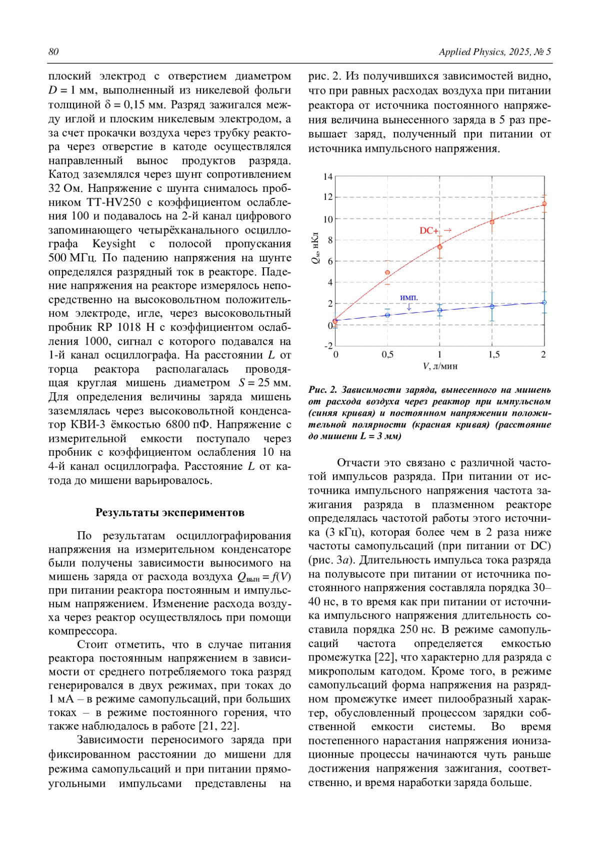 Проведена экспериментальная оценка количества заряда, выносимого из коаксиально-го плазменного реактора с микрополым катодом в зависимости от напряжения питания и скорости прокачки газа через активную зону реактора. Показано, что количество заряда, выносимого из реактора, определяется не только прокачкой газоразрядного промежутка и расстояния до мишени, но и от режима горения разряда. Сравнительный анализ режимов питания реактора выявил значительную разницу в эффективности генерации и транспорта заряда: при использовании источника постоянного высокого напряжения выносимый заряд превышает аналогичный показатель в импульсном режиме в 5 раз. Данное различие обусловлено как повышенной частотой зажигания разряда, так и увеличенной длительностью ионизационных процессов в непрерывном режиме. В то же время установлено, что комбинация регулируемого импульсного высоковольтного питания и управляемой скорости газового потока позволяет гибко контролировать динамику выноса заряда, обеспечивая возможность дозированного и локализованного плазменного воздействия.