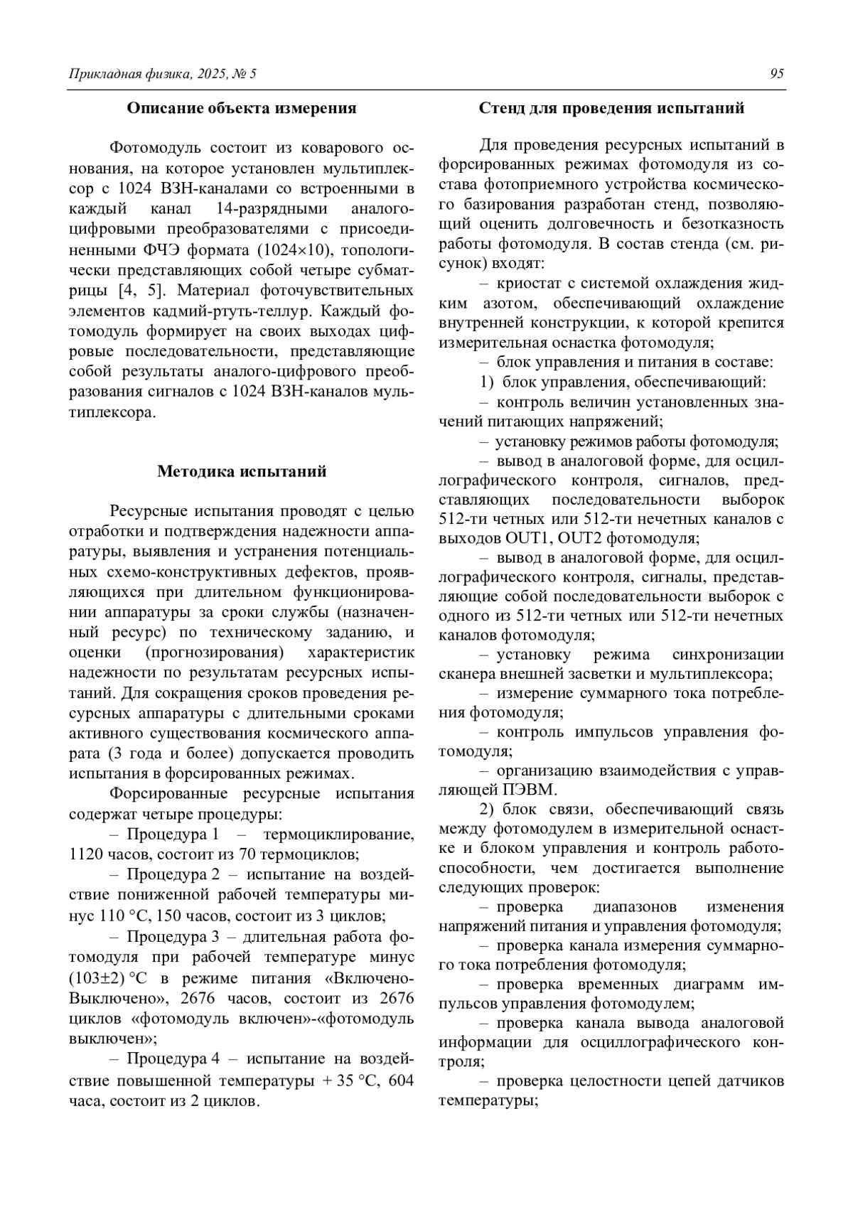 Спроектирован стенд для проведения ресурсных испытаний в форсированных режимах фотомодуля (ФМ) инфракрасного диапазона (ИК) с режимом временной задержки и накопления (ВЗН) из состава фотоприемного устройства космического базирования. Особенностью разработки является возможность получения экспериментальных данных об отказах, возникающих при длительном функционировании ФМ, которые оказывают влияние на пороговые характеристики устройства. Стенд позволяет подтвердить достаточность мер для обеспечения долговечности и безотказности работы фотомодуля, а также оценить надежность всей аппаратуры применения в целом. Апробация стенда будет проведена посредством запланированных испытаний.