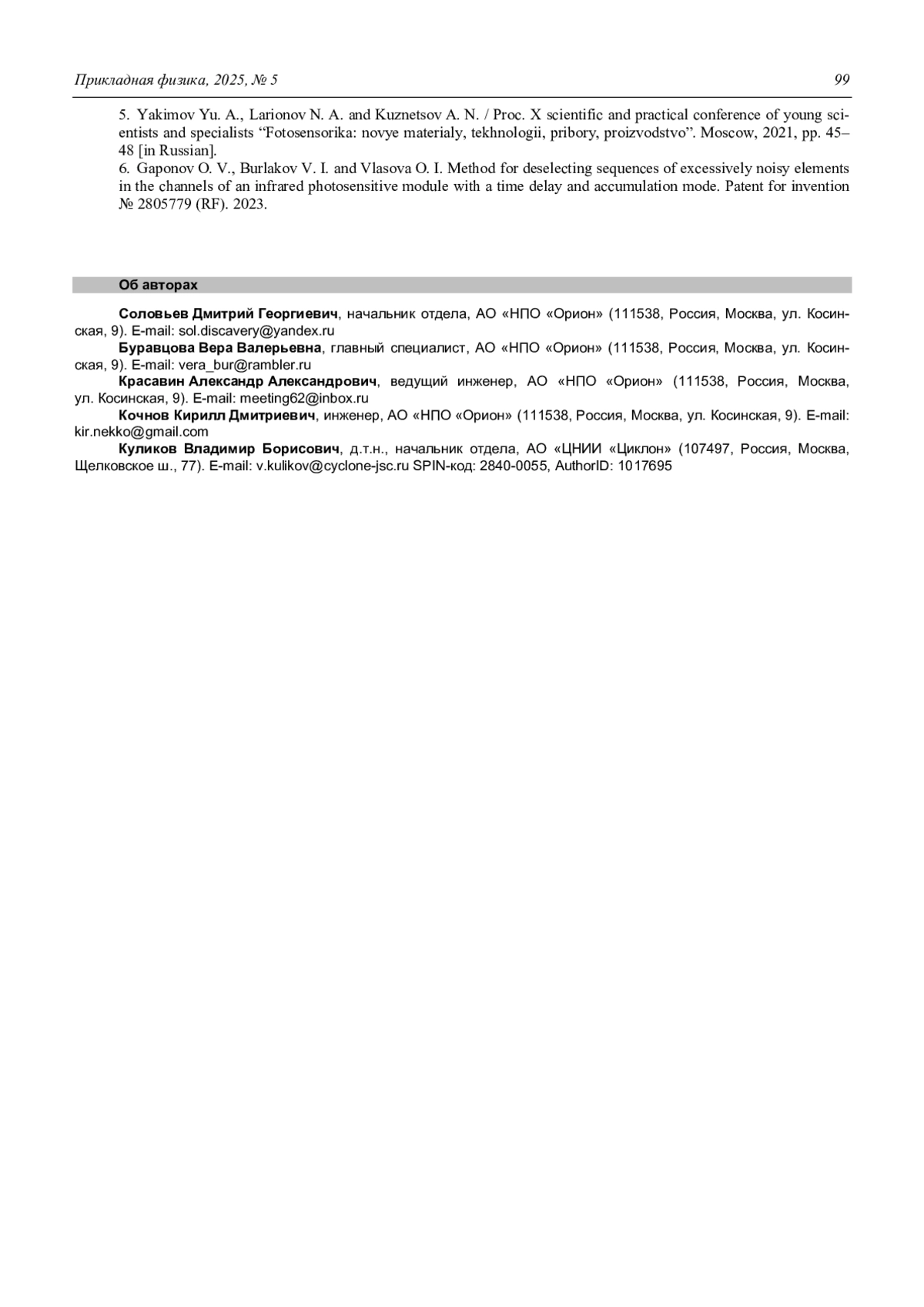 - Гапонов О. В., Бурлаков В. И., Власова О. И. Способ деселекции последовательностей избыточно шумящих элементов в каналах инфракрасного фото-чувствительного модуля с режимом временной задержки и накопления. Патент на изобретение № 2805779 (РФ). 2023.