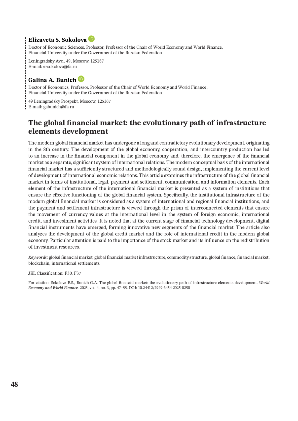 Современный мировой финансовый рынок прошел достаточно длинный и противоречивый эволюционный путь развития, беря свое начало в VIII в. Развитие мирового хозяйства, кооперационного взаимодействия, межстранового производства привело к увеличению финансовой составляющей в мировой экономике и как следствие выделения финансового рынка в отдельную значимую систему международных отношений. Современная концептуальная основа международного финансового рынка имеет достаточно структурированную и методологически обоснованную конструкцию, реализующую современный уровень развития международных экономических отношений. В статье рассмотрена инфраструктура мирового финансового рынка в разрезе институциональных, правовых, платежно-расчетных, коммуникационных и информационных элементов. Каждый элемент инфраструктуры международного финансового рынка представлен как система институтов, обеспечивающих достижение эффективного функционирования мировой финансовой системы в целом. В частности, институциональная инфраструктура современного мирового финансового рынка рассматривается как система международных и региональных финансовых институтов, а платежно-расчетная инфраструктура через призму взаимосвязанных элементов, которые обеспечивают движение валютных ценностей на международном уровне в системе внешнеэкономической, международной кредитной и инвестиционной деятельности. Отмечено, что на современном этапе развития финансовых технологий появились цифровые финансовые инструменты, формирующие инновационные новые сегменты финансового рынка. В статье также приведен анализ развития мирового кредитного рынка и роль международного кредита в современной мировой экономике. Особое место в статье уделено значению фондового рынка и его влиянию на систему перераспределения инвестиционных ресурсов.
