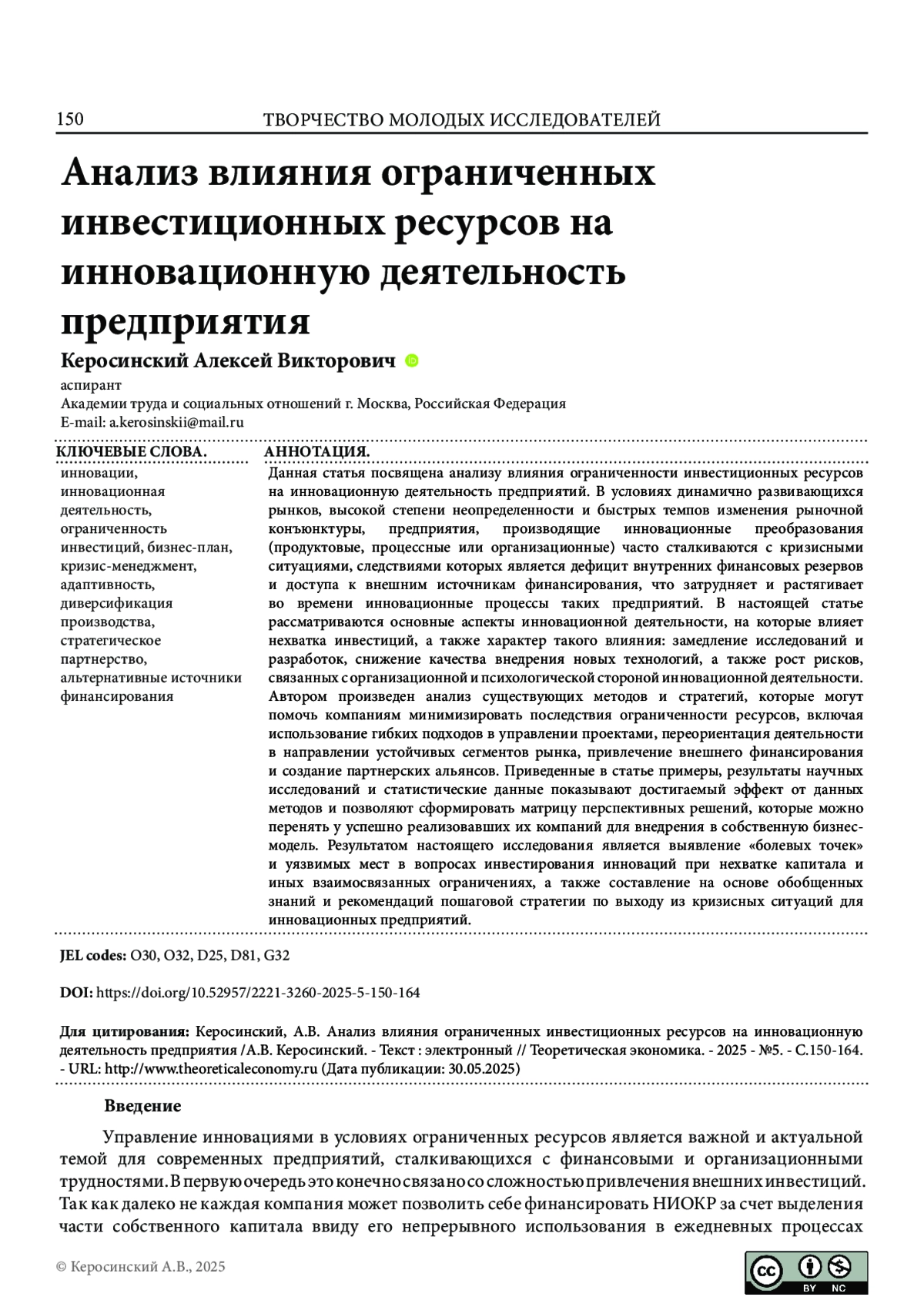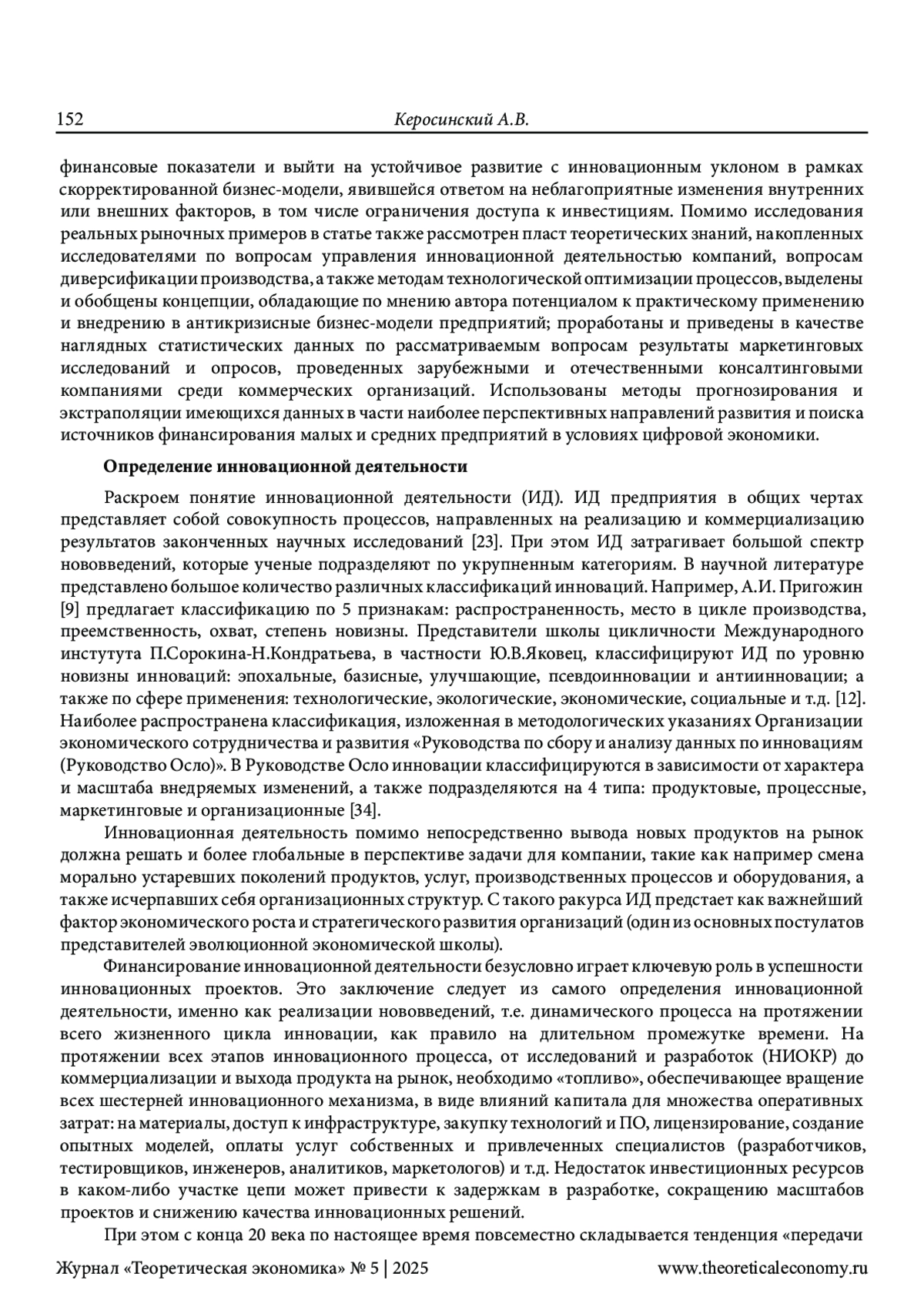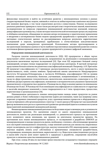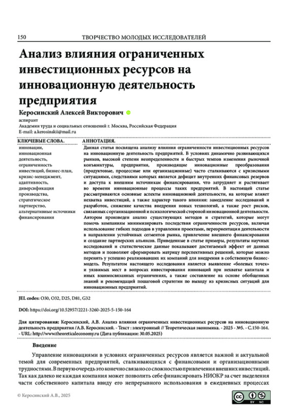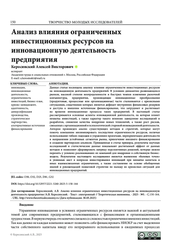 КЕРОСИНСКИЙ А. В. АНАЛИЗ ВЛИЯНИЯ ОГРАНИЧЕННЫХ ИНВЕСТИЦИОННЫХ РЕСУРСОВ НА ИННОВАЦИОННУЮ ДЕЯТЕЛЬНОСТЬ ПРЕДПРИЯТИЯ // ТЕОРЕТИЧЕСКАЯ ЭКОНОМИКА. 2025. № 5 (125)