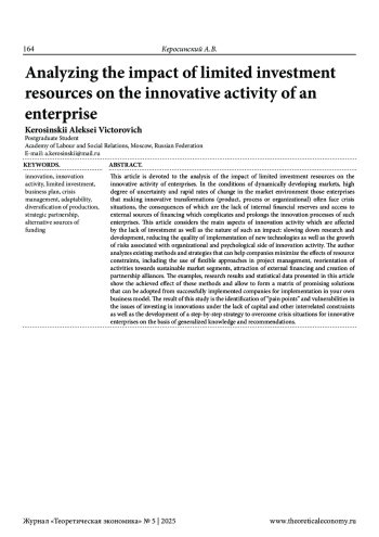 Данная статья посвящена анализу влияния ограниченности инвестиционных ресурсов на инновационную деятельность предприятий. В условиях динамично развивающихся рынков, высокой степени неопределенности и быстрых темпов изменения рыночной конъюнктуры, предприятия, производящие инновационные преобразования (продуктовые, процессные или организационные) часто сталкиваются с кризисными ситуациями, следствиями которых является дефицит внутренних финансовых резервов и доступа к внешним источникам финансирования, что затрудняет и растягивает во времени инновационные процессы таких предприятий. В настоящей статье рассматриваются основные аспекты инновационной деятельности, на которые влияет нехватка инвестиций, а также характер такого влияния: замедление исследований и разработок, снижение качества внедрения новых технологий, а также рост рисков, связанных с организационной и психологической стороной инновационной деятельности. Автором произведен анализ существующих методов и стратегий, которые могут помочь компаниям минимизировать последствия ограниченности ресурсов, включая использование гибких подходов в управлении проектами, переориентация деятельности в направлении устойчивых сегментов рынка, привлечение внешнего финансирования и создание партнерских альянсов. Приведенные в статье примеры, результаты научных исследований и статистические данные показывают достигаемый эффект от данных методов и позволяют сформировать матрицу перспективных решений, которые можно перенять у успешно реализовавших их компаний для внедрения в собственную бизнес-модель. Результатом настоящего исследования является выявление «болевых точек» и уязвимых мест в вопросах инвестирования инноваций при нехватке капитала и иных взаимосвязанных ограничениях, а также составление на основе обобщенных знаний и рекомендаций пошаговой стратегии по выходу из кризисных ситуаций для инновационных предприятий.