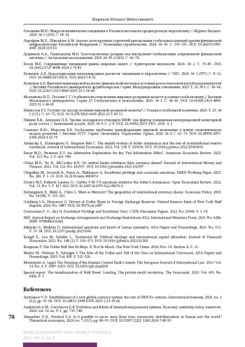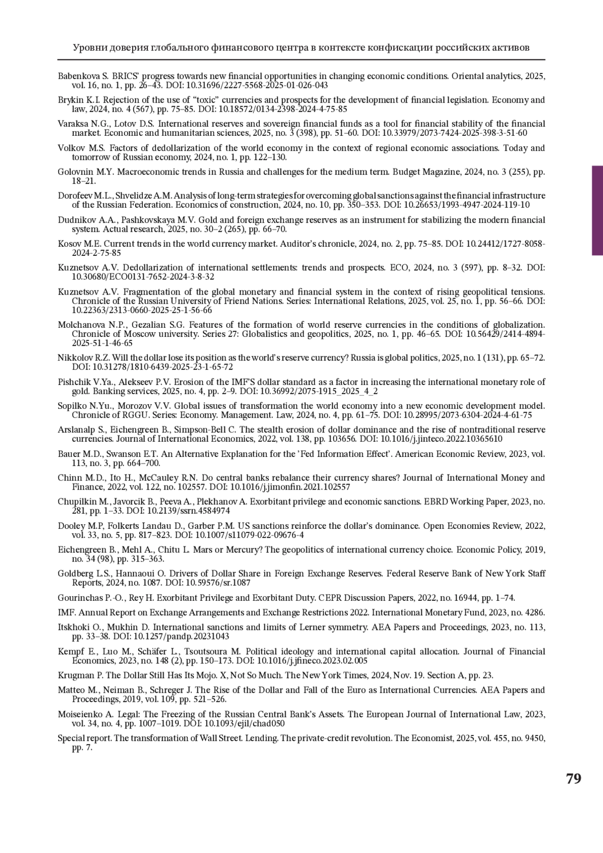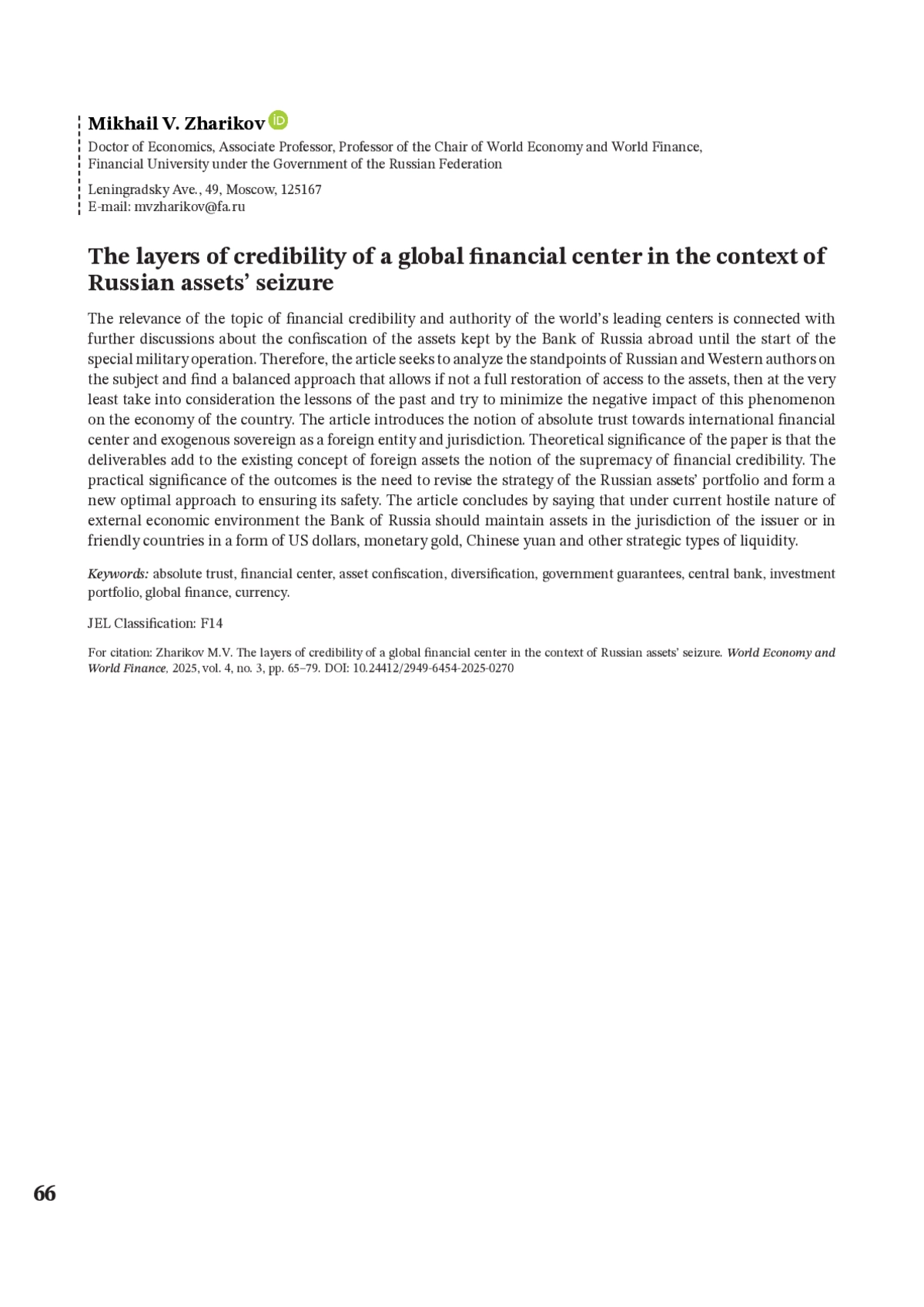 ЖАРИКОВ М. В. УРОВНИ ДОВЕРИЯ ГЛОБАЛЬНОГО ФИНАНСОВОГО ЦЕНТРА В КОНТЕКСТЕ КОНФИСКАЦИИ РОССИЙСКИХ АКТИВОВ // МИРОВАЯ ЭКОНОМИКА И МИРОВЫЕ ФИНАНСЫ. 2025. № 3, ТОМ 4