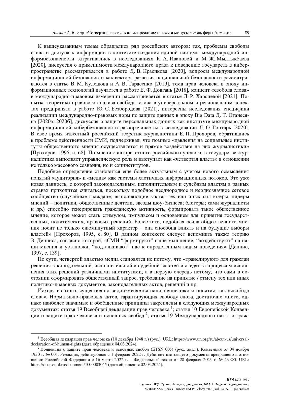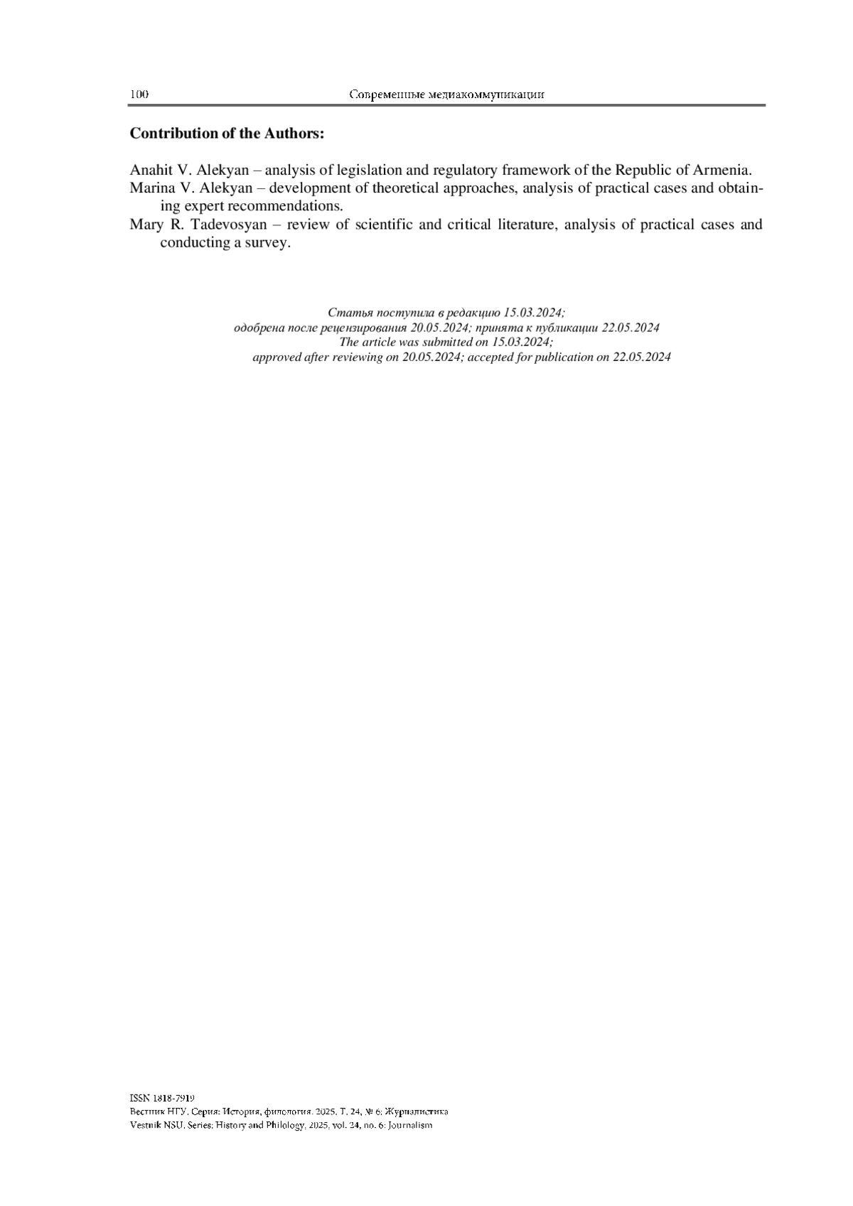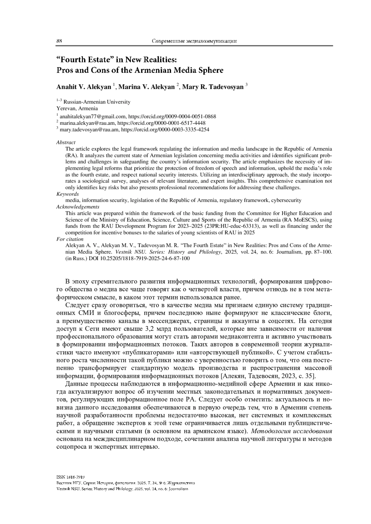 АЛЕКЯН А. В., АЛЕКЯН М. В., ТАДЕВОСЯН М. Р. «ЧЕТВЕРТАЯ ВЛАСТЬ» В НОВЫХ РЕАЛИЯХ: ПЛЮСЫ И МИНУСЫ МЕДИАСФЕРЫ АРМЕНИИ // ВЕСТНИК НГУ. СЕРИЯ: ИСТОРИЯ, ФИЛОЛОГИЯ. 2025. ТОМ 24, № 6
