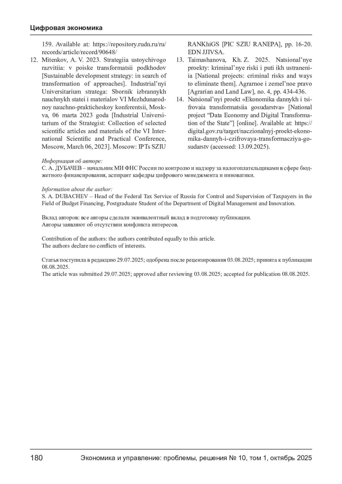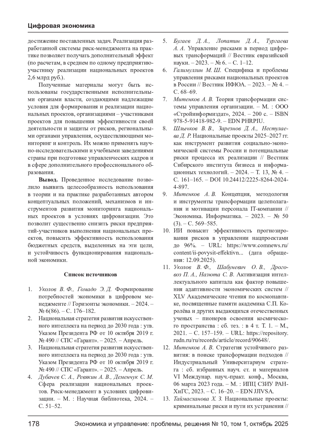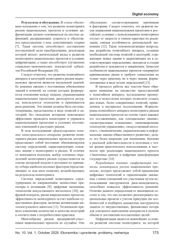 ДУБАЧЕВ С. А. РАЗВИТИЕ МОНИТОРИНГА РИСКОВ НАЦИОНАЛЬНЫХ ПРОЕКТОВ В УСЛОВИЯХ ЦИФРОВИЗАЦИИ // ЭКОНОМИКА И УПРАВЛЕНИЕ: ПРОБЛЕМЫ, РЕШЕНИЯ. 2025. ТОМ 1 № 10