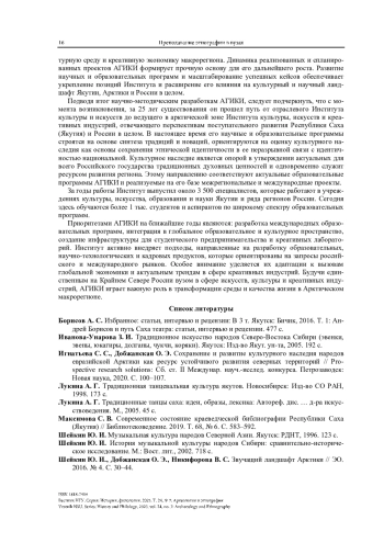 Рассмотрены проблемы сохранения культурного наследия коренных народов Республики Саха (Якутия) и Арктики в целом в контексте программ модернизации системы образования в России и ее субъектах. На примере Арктического государственного института культуры и искусств (АГИКИ) прослежены основные тенденции в развитии этнокультурного образования в едином социокультурном пространстве России рубежа ХХ–XXI вв. Показано, как с момента образования АГИКИ прошел путь от отраслевого института культуры и искусств до ведущего в арктической зоне института культуры, искусств и креативных индустрий, отвечающего перспективам поступательного развития Республики Саха (Якутия) и России в целом.