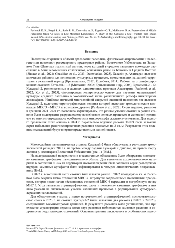 15. Pavlenok K., Kot M., Moska P., Leloch M., Muhtarov G., Kogai S., Khudjanazarov M., Holmatov A., Szymczak K. New evidence for mountain Palaeolithic human occupation in the western Tian Shan piedmonts, eastern Uzbekistan // Antiquity Project Gallery. 2022. Vol. 96 (389). P. 1292-1300. https://doi.org/10.15184/aqy.2022.99