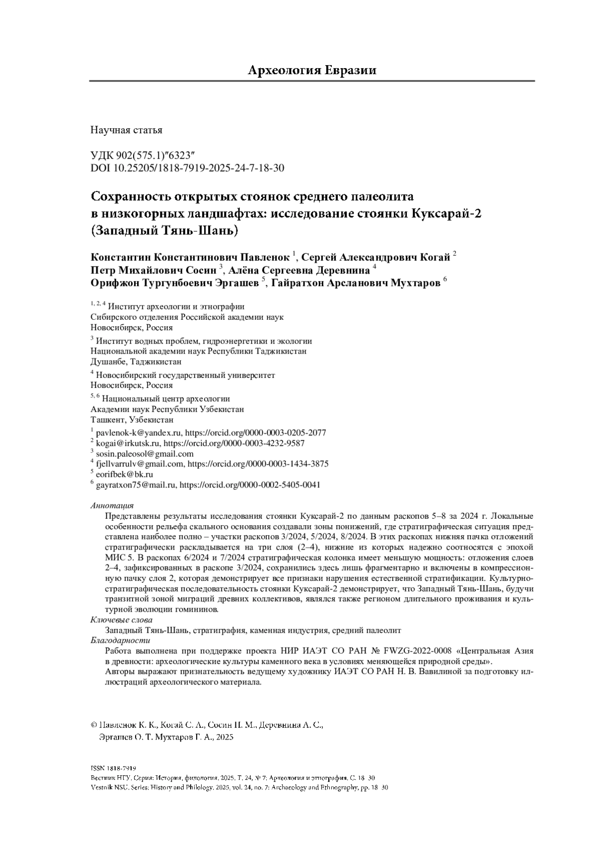 12. Kot M., Kogai S., Pavlenok G., Gryczewska N., Brancaleoni G., Krajcarz M. T., Moska P., Leloch M., Khudjanazarov M., Szymczak K., Muhtarov G., Pavlenok K. New Data for Asymmetric Core Reduction in Western Tian Shan Piedmonts: The Ertash Sai 2 Open-Air Site // Lithic Technology. 2025. Vol. 50, iss. 1. P. 1-2. https://doi.org/10.1080/01977261.2024.2319429
