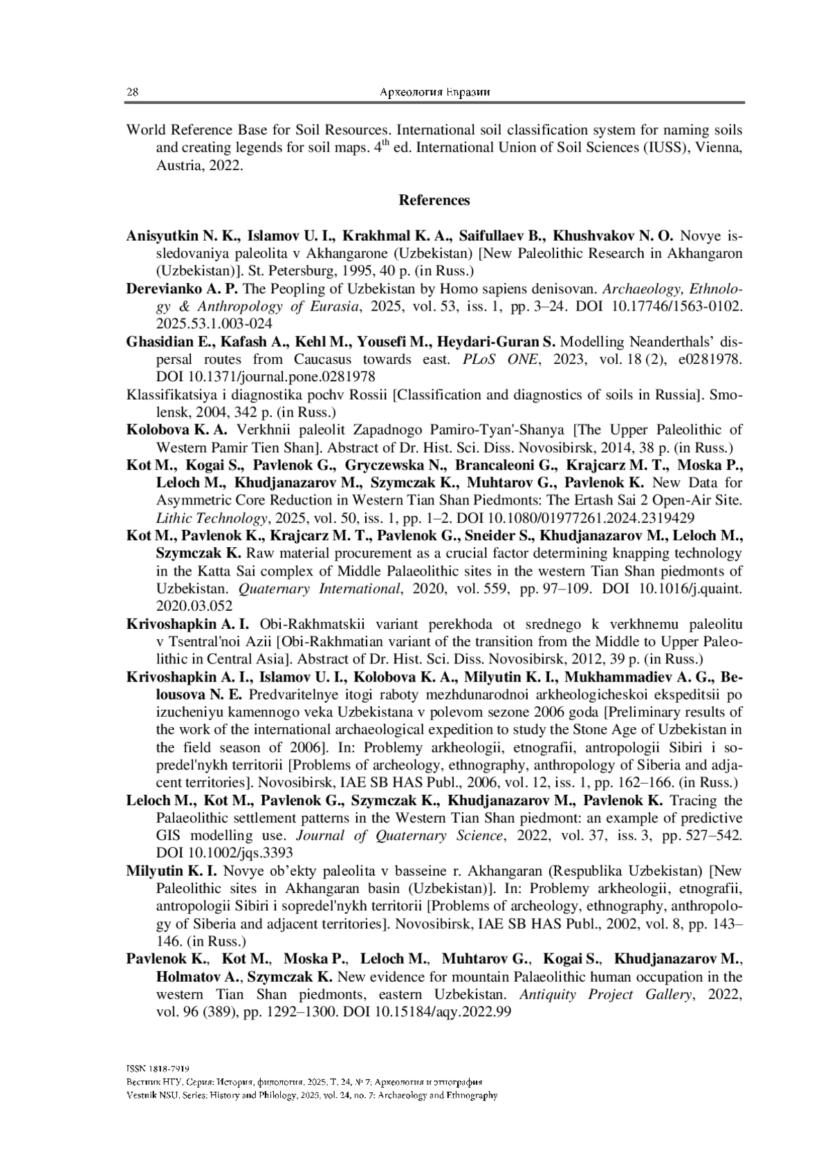 10. Derevianko A. P. The Peopling of Uzbekistan by Homo sapiens denisovan // Archaeology, Ethnol ogy & Anthropology of Eurasia. 2025. Vol. 53, iss. 1. P. 3-24. https://doi.org/10.17746/1563-0102.2025.53.1.003-024