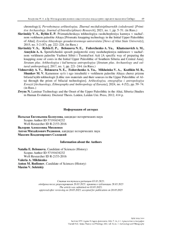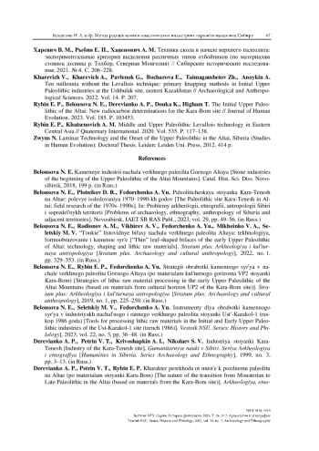 21. Rybin E. P., Belousova N. E., Derevianko A. P., Douka K., Higham T. The Initial Upper Paleo lithic of the Altai: New radiocarbon determinations for the Kara-Bom site // Journal of Human Evolution. 2023. Vol. 185. P. 103453.
