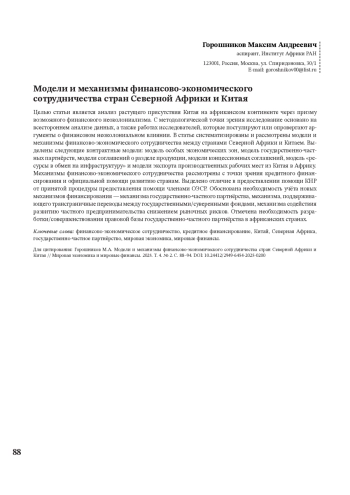 Ключевые фразы: финансово-экономическое сотрудничество, кредитное финансирование, Китай, Северная Африка, государственно-частное партнерство, мировая экономика, мировые финансы