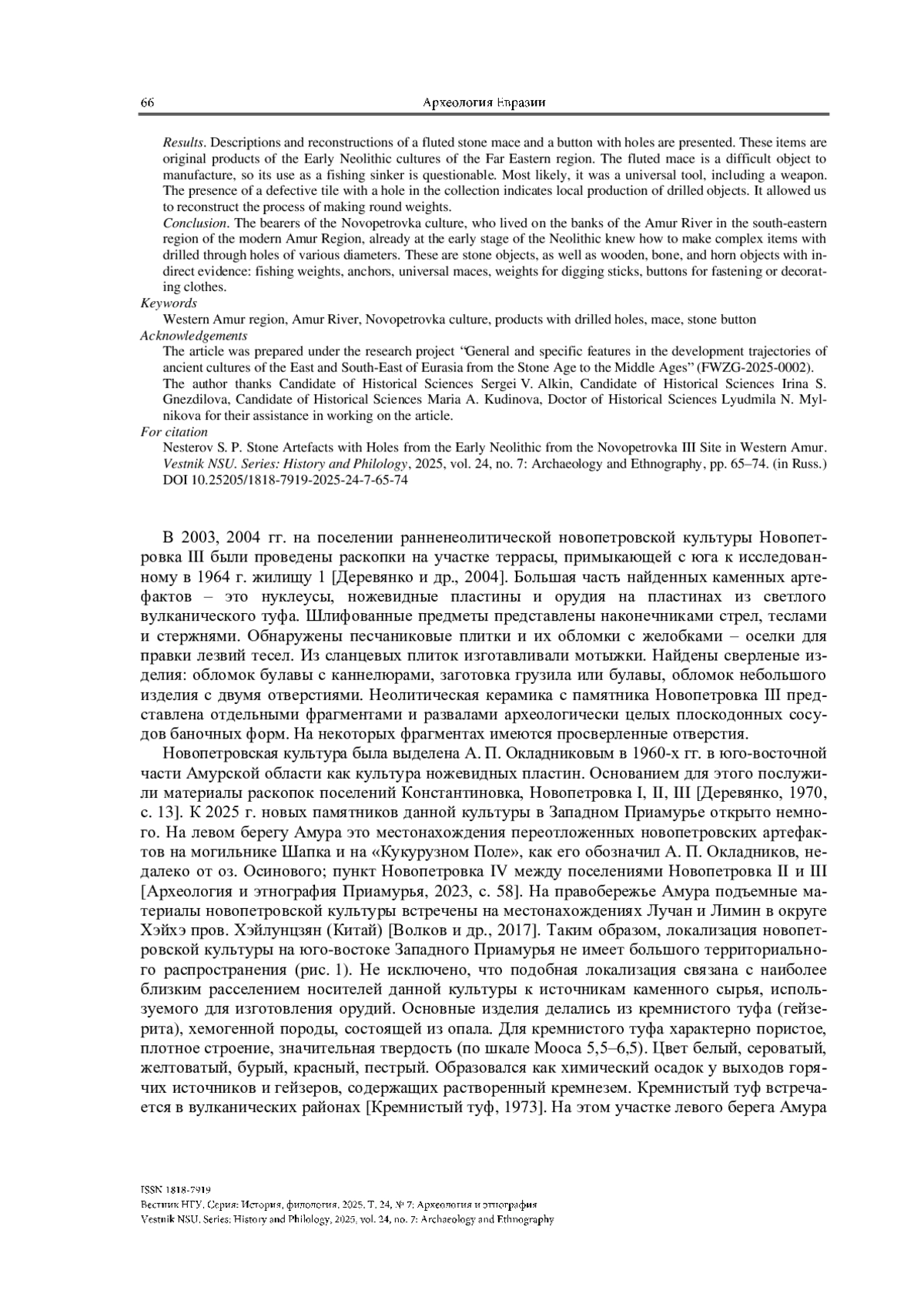 Представлены описания и реконструкции каменной булавы с каннелюрами и пуговицы с отверстиями с поселения Новопетровка III (9,5–9,0 тыс. л. н.) новопетровской культуры Западного Приамурья. Эти предметы являются оригинальными изделиями для ранненеолитических культур дальневосточного региона. Наличие в коллекции бракованной плитки с отверстием свидетельствует о местном изготовлении сверленых предметов. Она позволила реконструировать процесс изготовления округлых грузил. Большинство новопетровских пуговиц могли изготавливаться из дерева, кости и рога. Сверла для получения отверстий в этих материалах присутствуют в орудийном наборе памятника Новопетровка III.