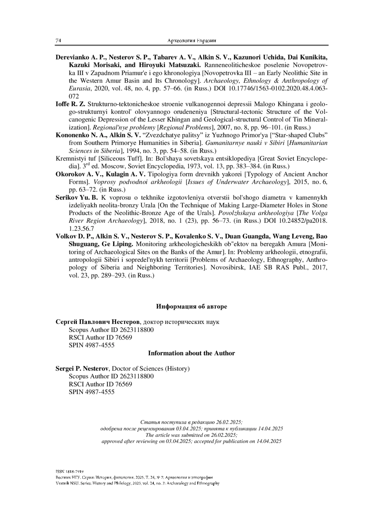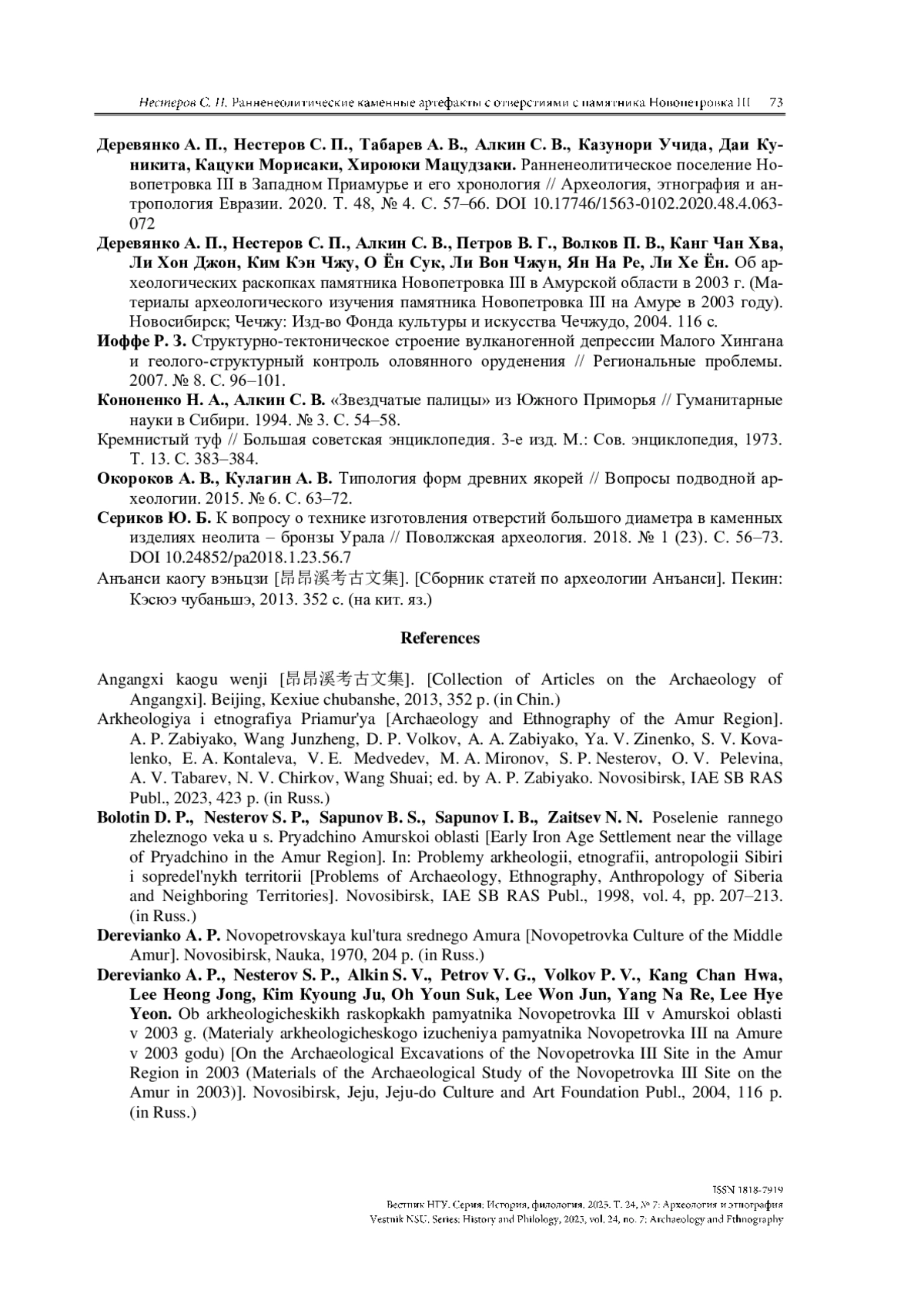 5. Деревянко А. П., Нестеров С. П., Табарев А. В., Алкин С. В., Казунори Учида, Даи Ку никита, Кацуки Морисаки, Хироюки Мацудзаки. Ранненеолитическое поселение Новопетровка III в Западном Приамурье и его хронология // Археология, этнография и ан тропология Евразии. 2020. Т. 48, № 4. С. 57-66. https://doi.org/10.17746/1563-0102.2020.48.4.063-072