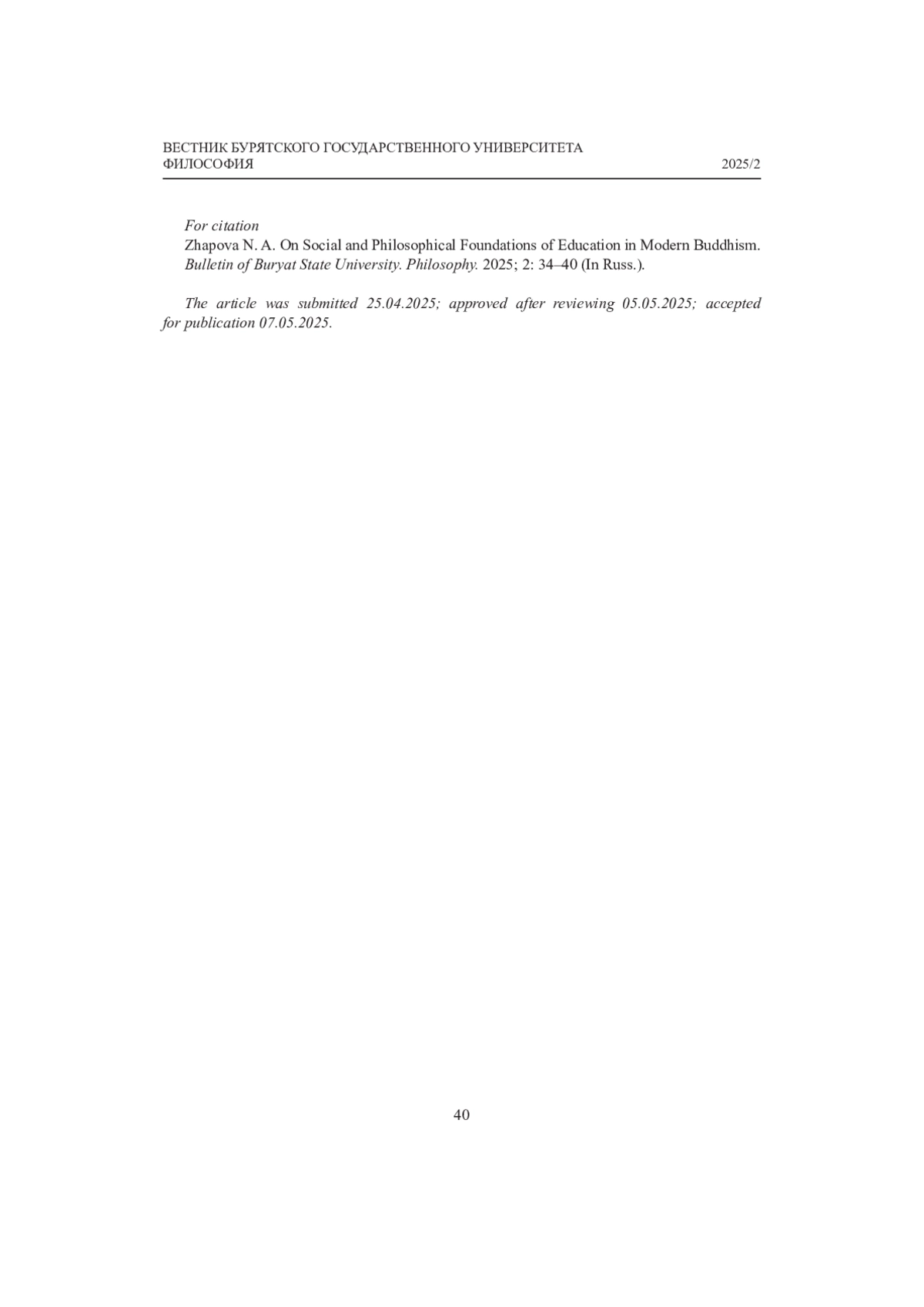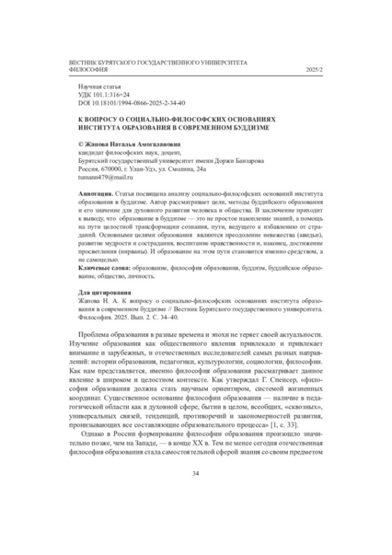 ЖАПОВА Н. А. К ВОПРОСУ О СОЦИАЛЬНО-ФИЛОСОФСКИХ ОСНОВАНИЯХ ИНСТИТУТА ОБРАЗОВАНИЯ В СОВРЕМЕННОМ БУДДИЗМЕ // ВЕСТНИК БУРЯТСКОГО ГОСУДАРСТВЕННОГО УНИВЕРСИТЕТА. 2025. № 2