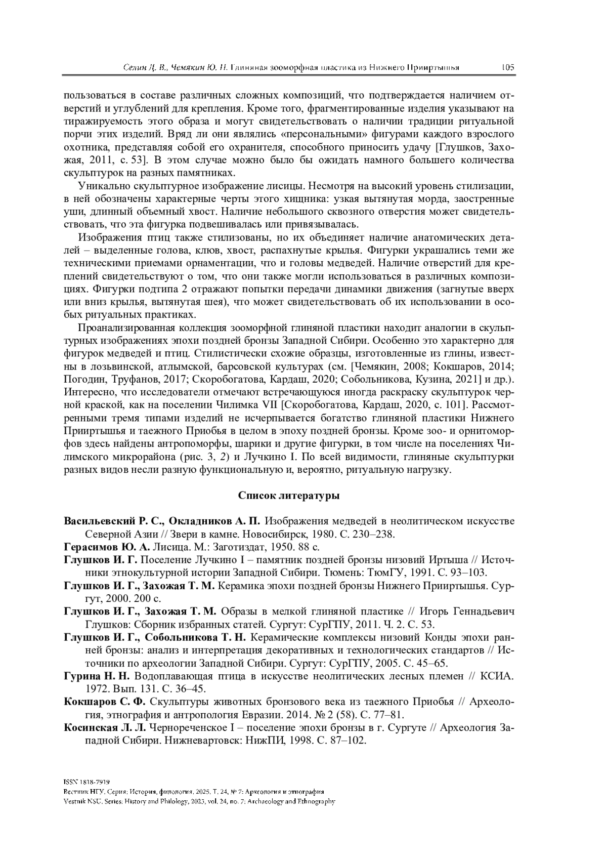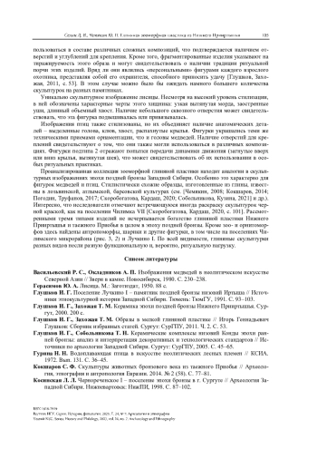 13. Сериков Ю. Б. Очерки по первобытному искусству Урала. Н. Тагил: НижГСПА, 2014. 268 с. Скоробогатова А. Ю., Кардаш О. В. Новые находки керамической скульптуры в Сургутском Приобье // Тр. VI (XXII) Всерос. археол. съезда в Самаре. Самара: СамГСПУ, 2020. Т. 3. С. 101-103.
